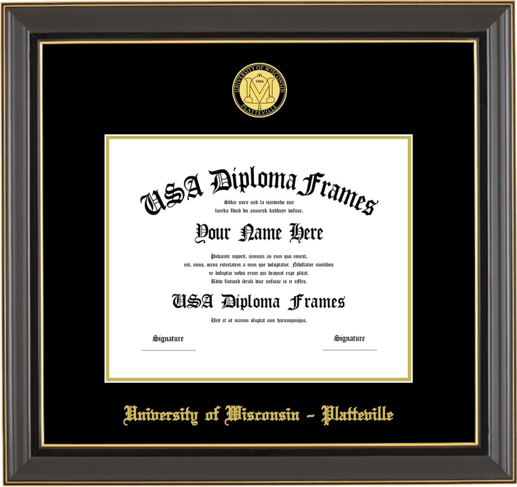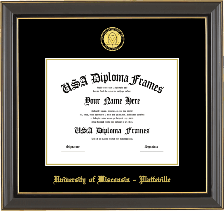 University of Wisconsin – Platteville Diploma Frame – Black Gold Trim Glossy – Black and Gold Mat