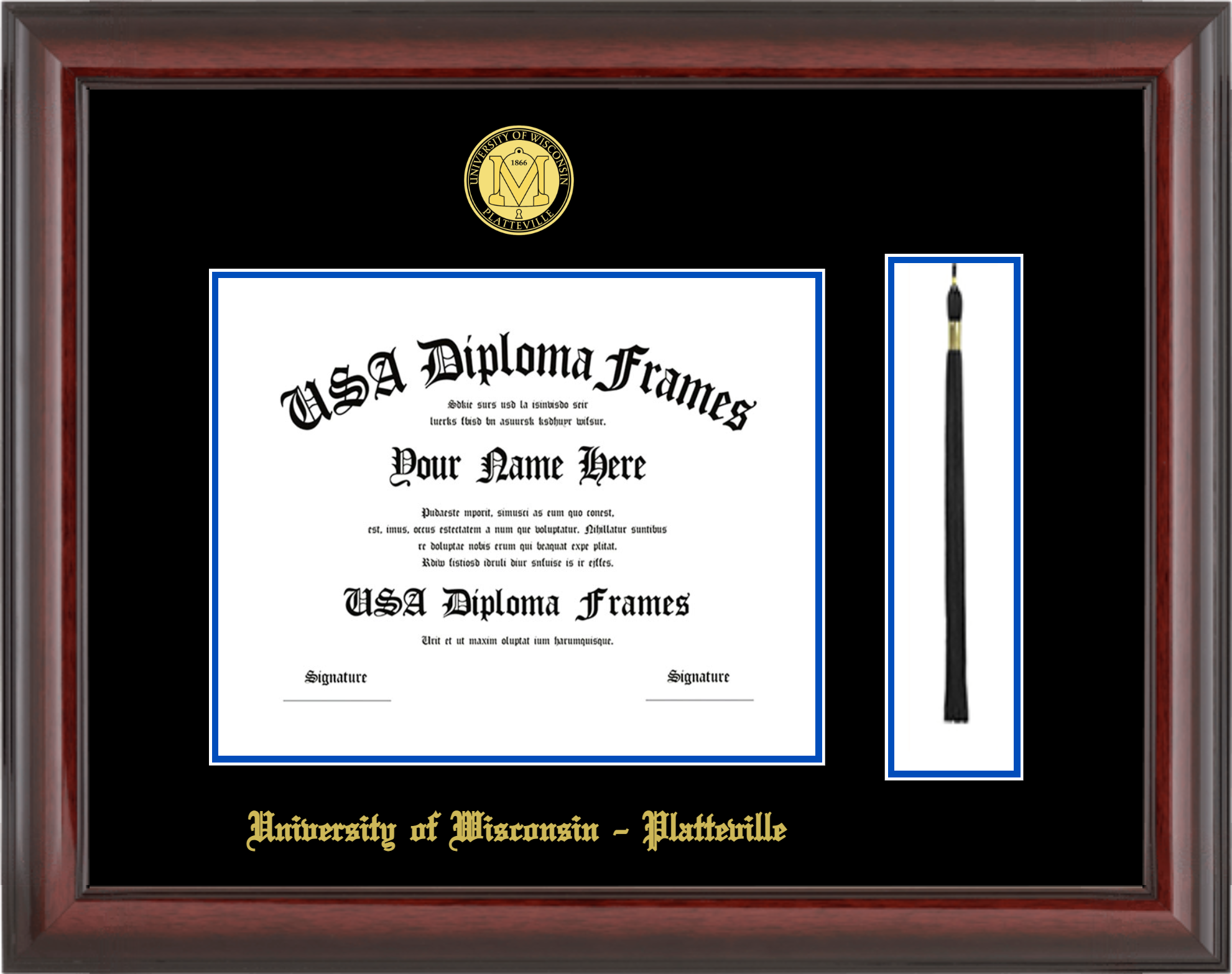 University of Wisconsin – Platteville Diploma Frame with Tassel – Cherry Mahogany Glossy – Black and Royal Blue Mat