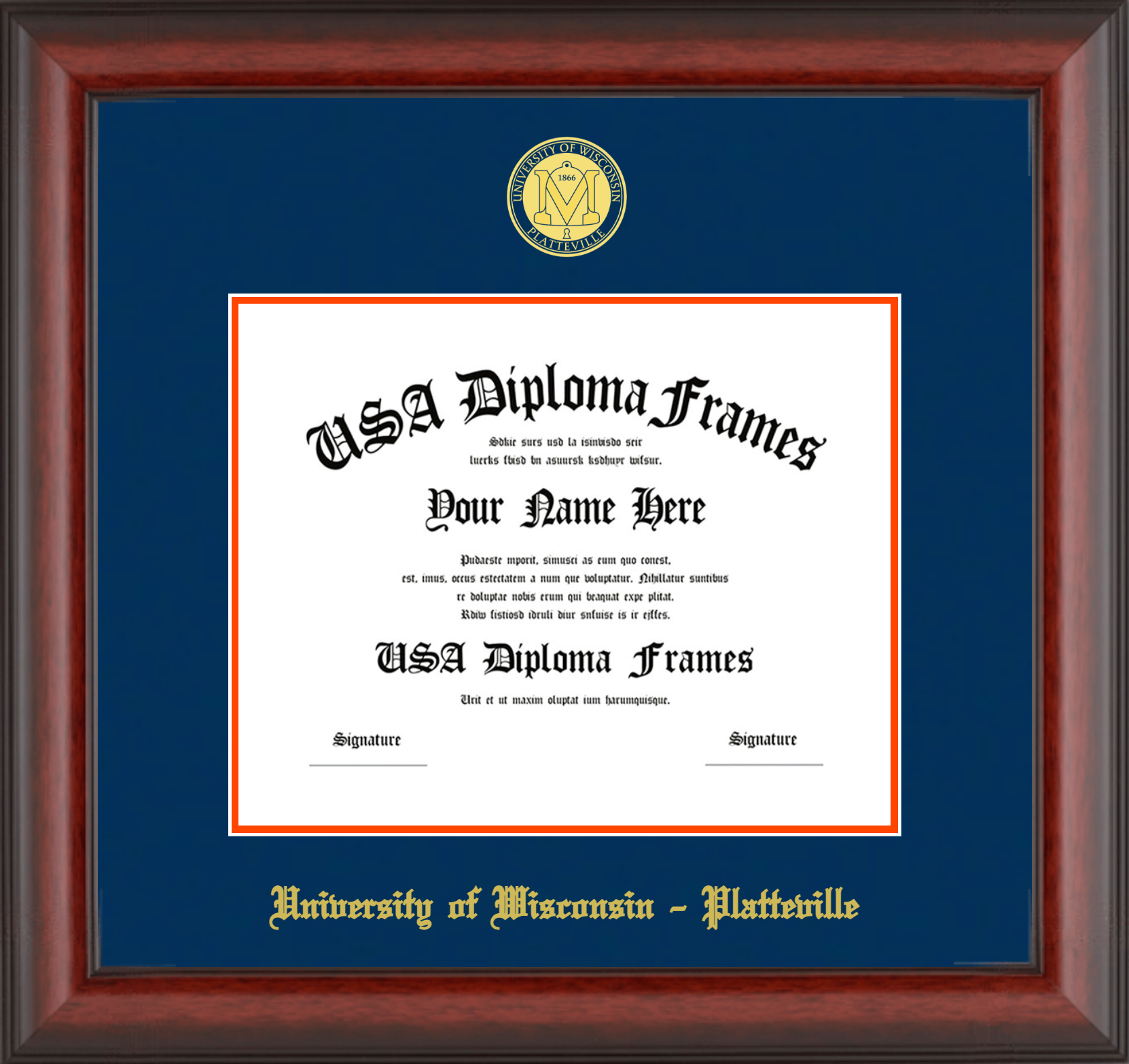 University of Wisconsin – Platteville Diploma Frame – Cherry Mahogany Matte – Navy and Orange Mat