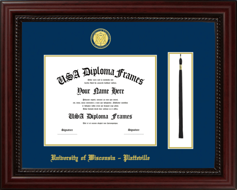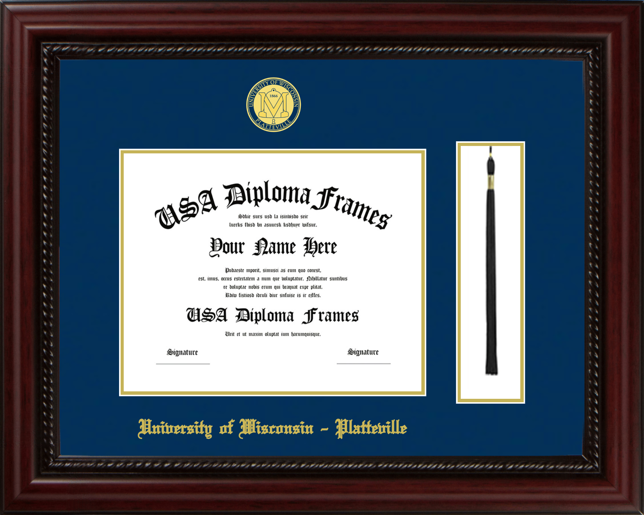 University of Wisconsin – Platteville Diploma Frame with Tassel – Executive Cherry Rope – Navy and Gold Mat