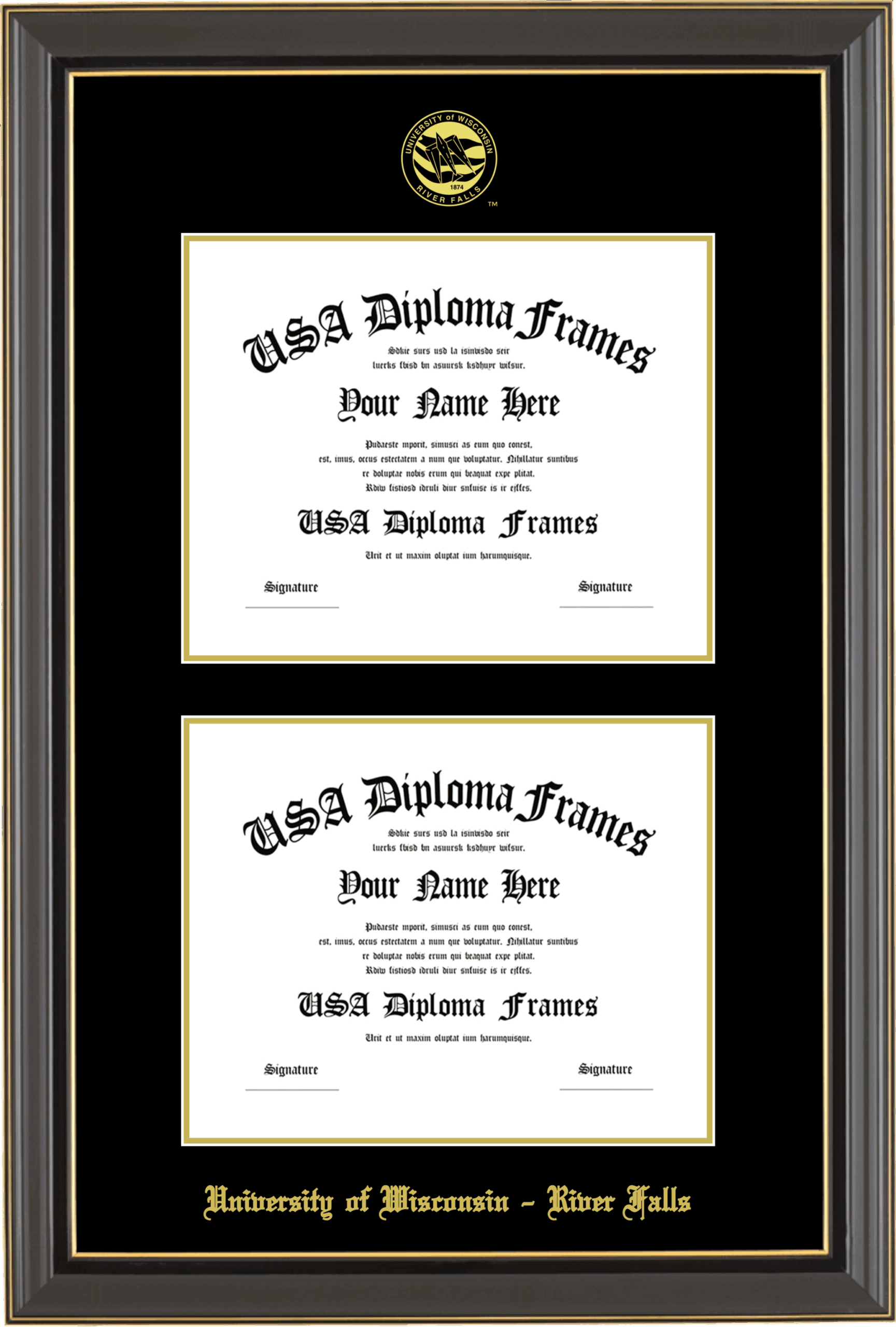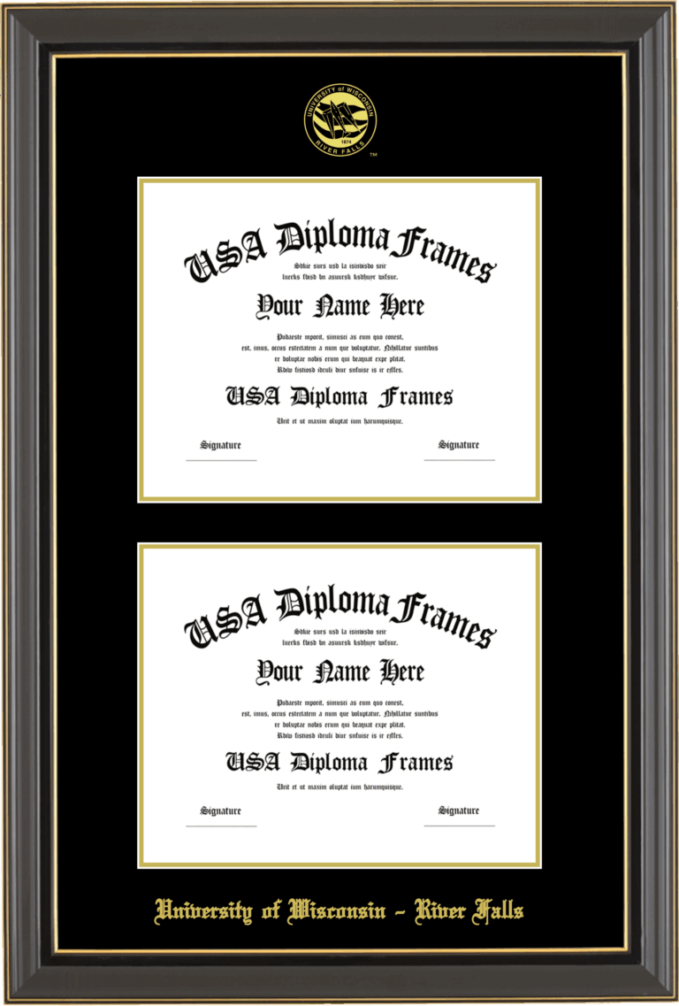 University of Wisconsin – River Falls Double Diploma Frame – Double Document – Black Gold Trim Glossy – Black and Gold Mat