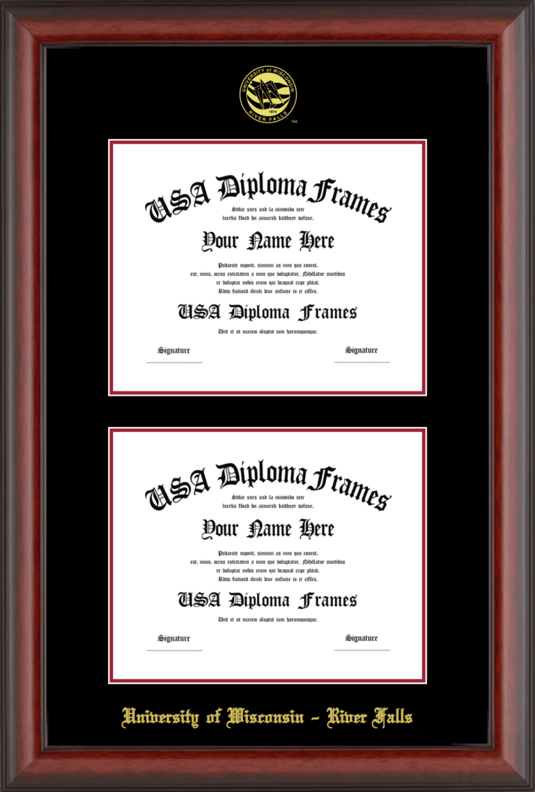 University of Wisconsin – River Falls Double Diploma Frame – Double Document – Cherry Mahogany Matte – Black and Crimson Mat