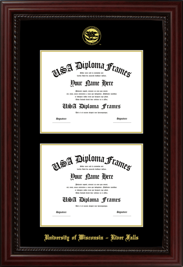 University of Wisconsin – River Falls Double Diploma Frame – Double Document – Executive Cherry Rope – Black and Gold Mat