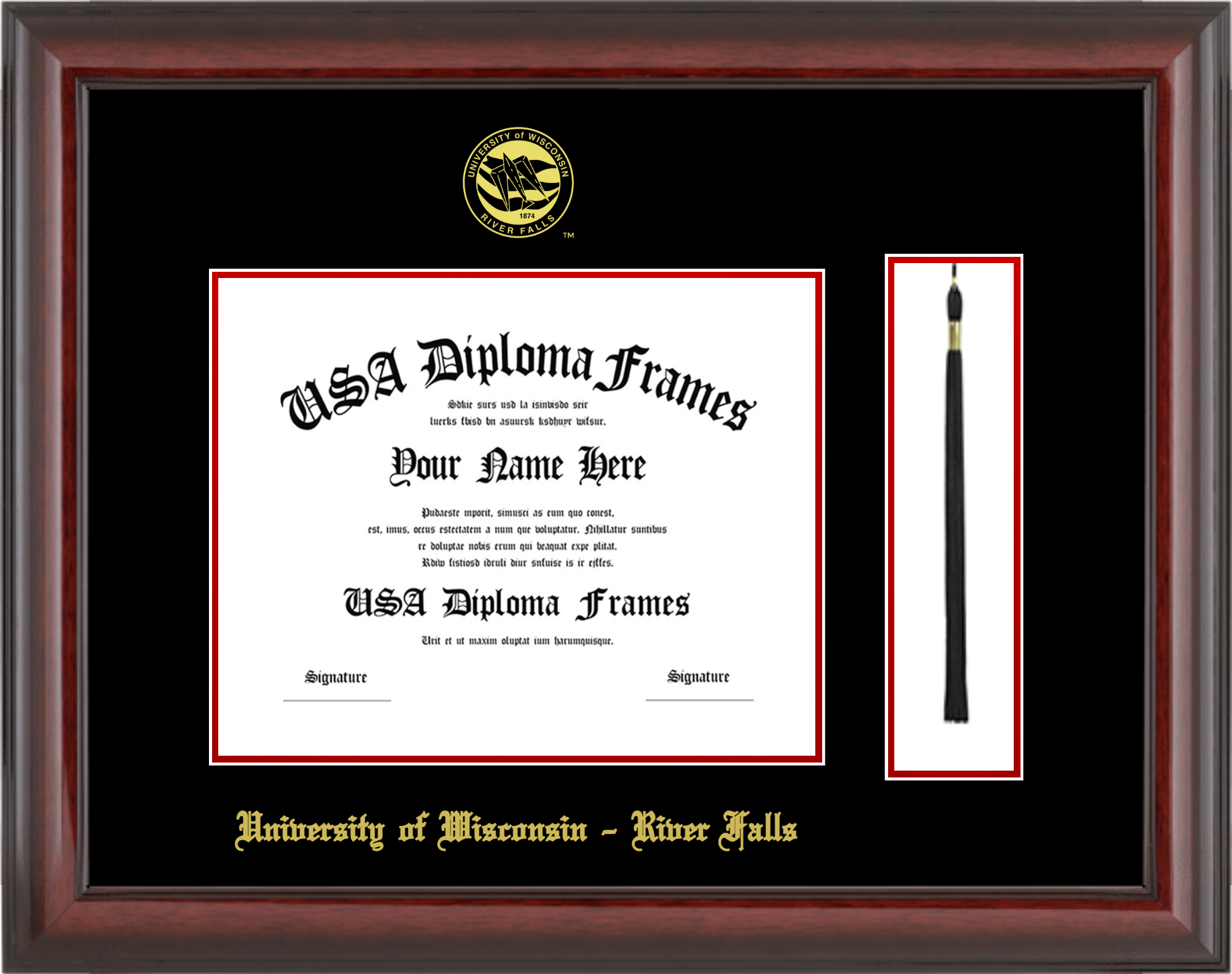 University of Wisconsin – River Falls – Single Horizontal Document ( Diploma ) – Cherry Mahogany Glossy – Black Mat – Red Accent Mat – With Tassel(Default) – With Seal(University Seal Gold) – With Gold Embossing (University of Wisconsin – River Falls)
