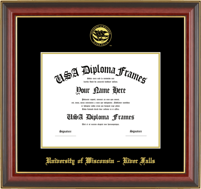 University of Wisconsin – River Falls – Single Horizontal Document ( Diploma ) – Cherry Mahogany Gold Trim Glossy – Black Mat – Gold Accent Mat – With Seal(University Seal Gold) – With Gold Embossing (University of Wisconsin – River Falls)