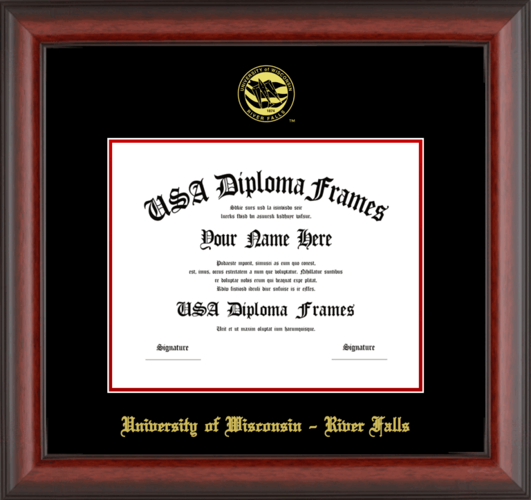 University of Wisconsin – River Falls – Single Horizontal Document ( Diploma ) – Cherry Mahogany Matte – Black Mat – Red Accent Mat – With Seal(University Seal Gold) – With Gold Embossing (University of Wisconsin – River Falls)