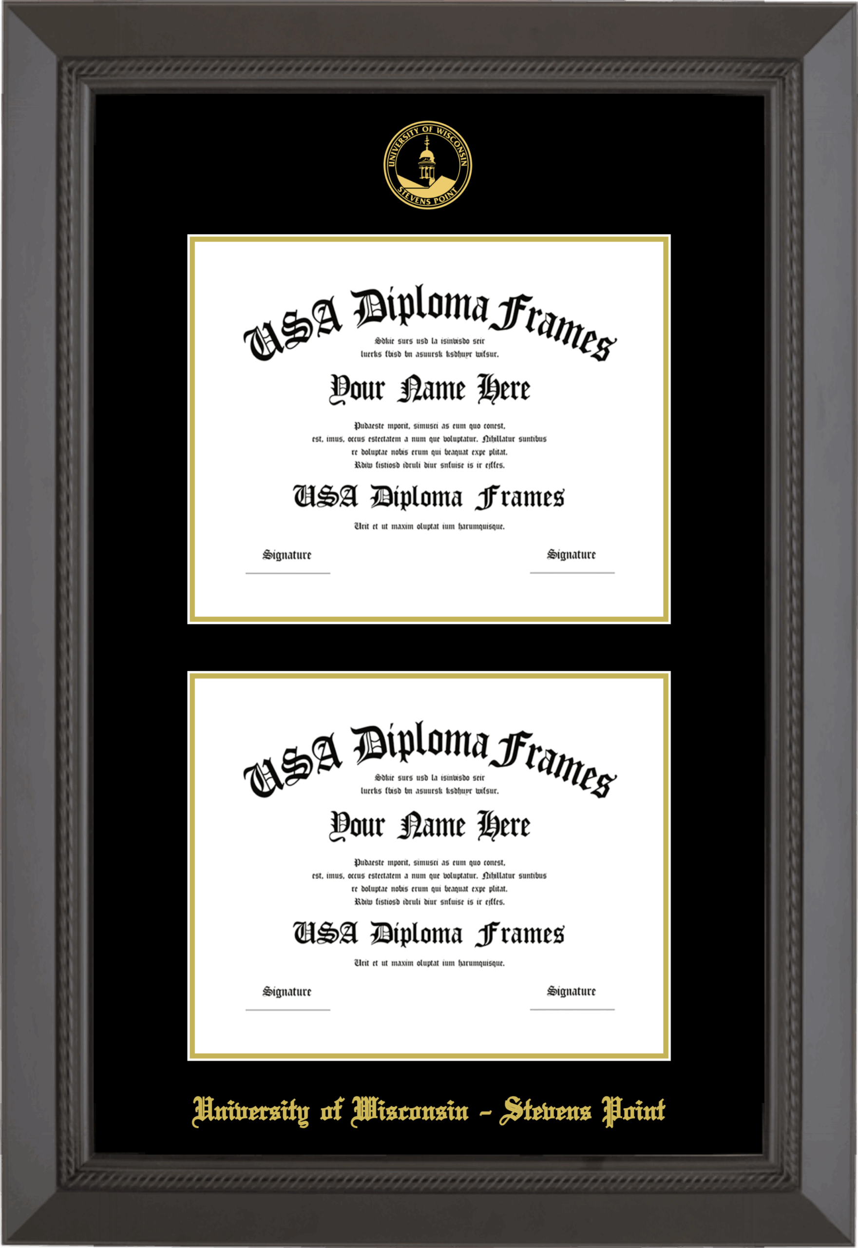 University of Wisconsin – Stevens Point Double Diploma Frame – Double Document – Black Rope – Black and Gold Mat