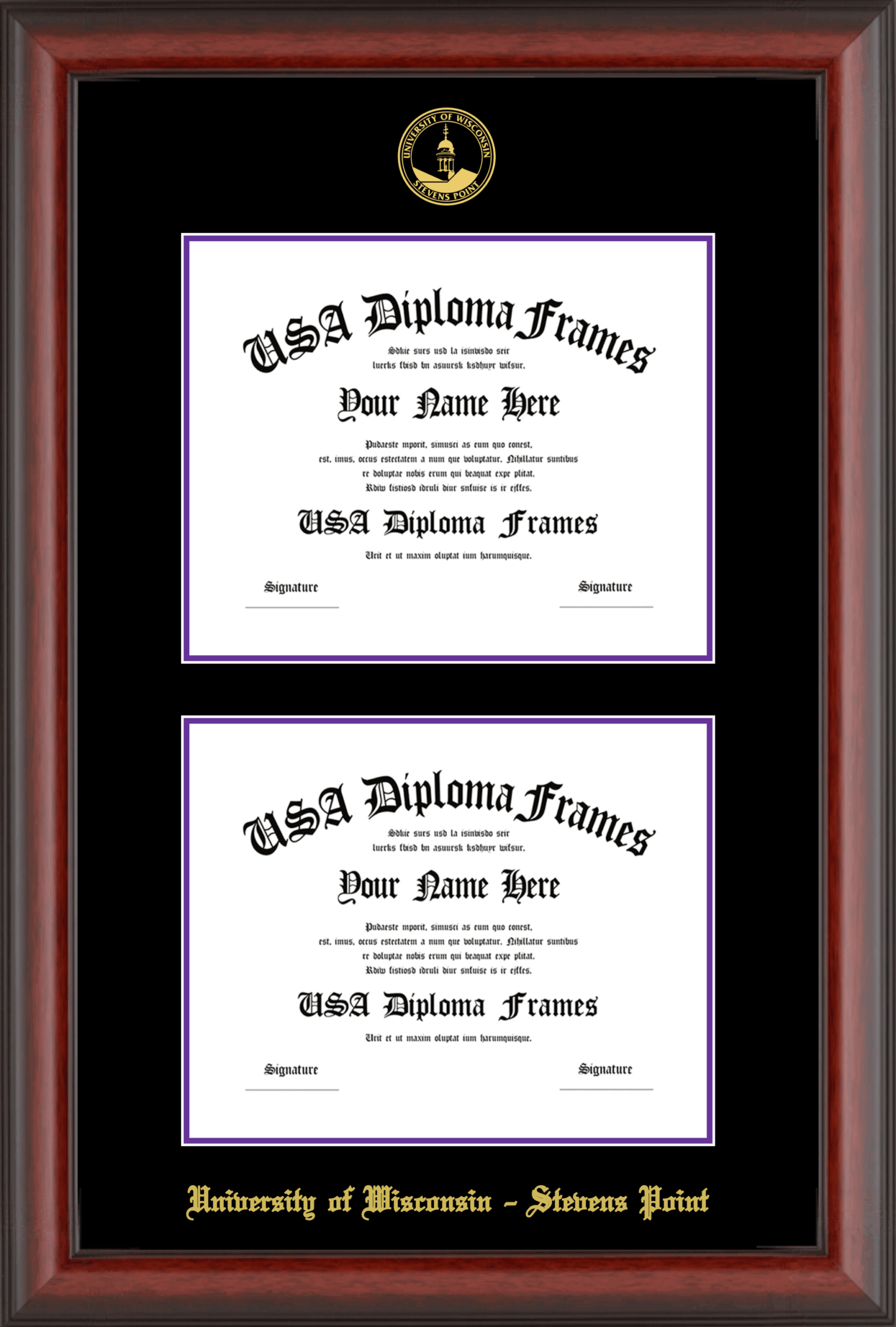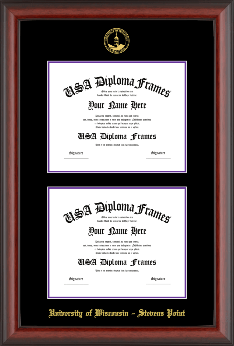 University of Wisconsin – Stevens Point Double Diploma Frame – Double Document – Cherry Mahogany Matte – Black and Purple Mat
