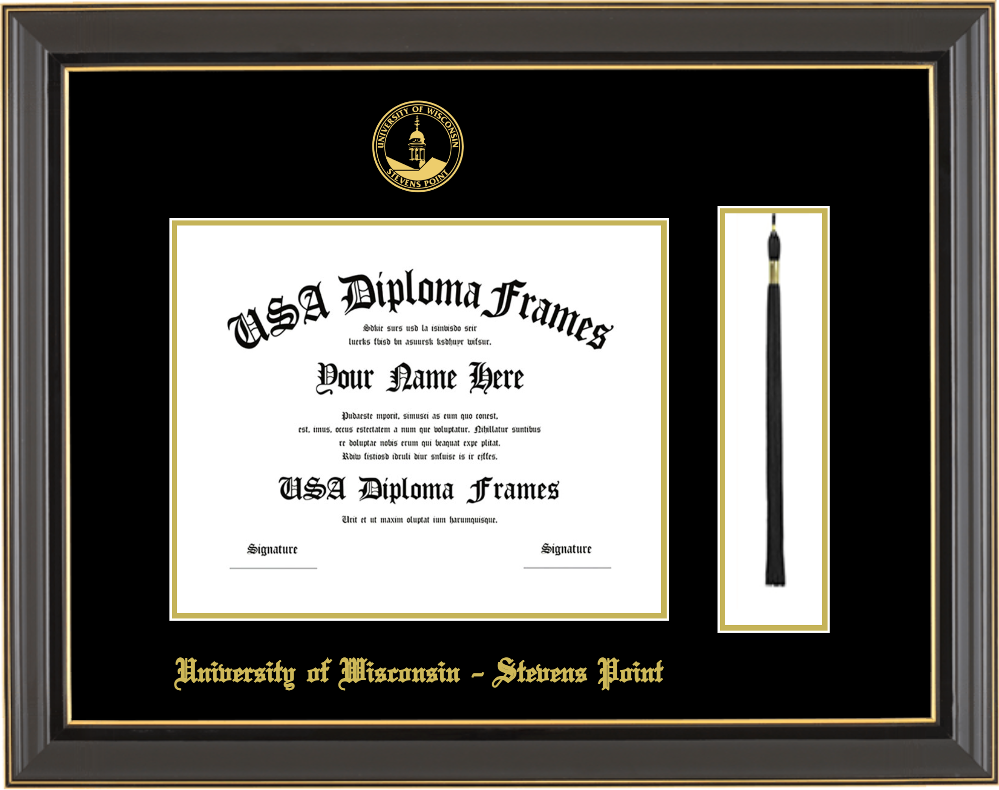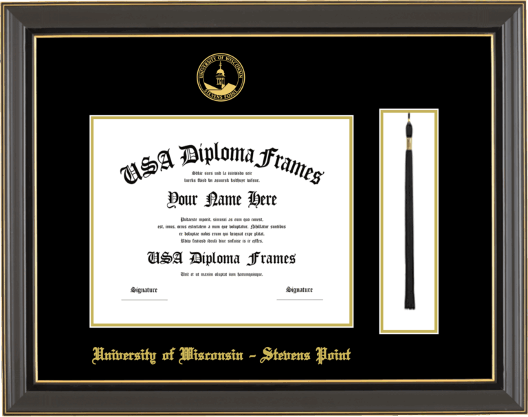 University of Wisconsin – Stevens Point – Single Horizontal Document ( Diploma ) – Black Gold Trim Glossy – Black Mat – Gold Accent Mat – With Tassel(Default) – With Seal(University Seal Gold) – With Gold Embossing (University of Wisconsin – Stevens Point)