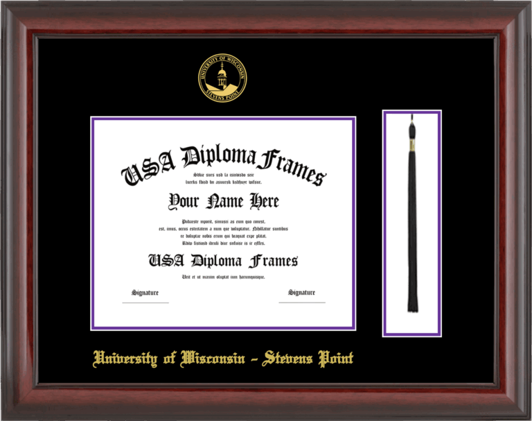 University of Wisconsin – Stevens Point – Single Horizontal Document ( Diploma ) – Cherry Mahogany Glossy – Black Mat – Purple Accent Mat – With Tassel(Default) – With Seal(University Seal Gold) – With Gold Embossing (University of Wisconsin – Stevens Point)