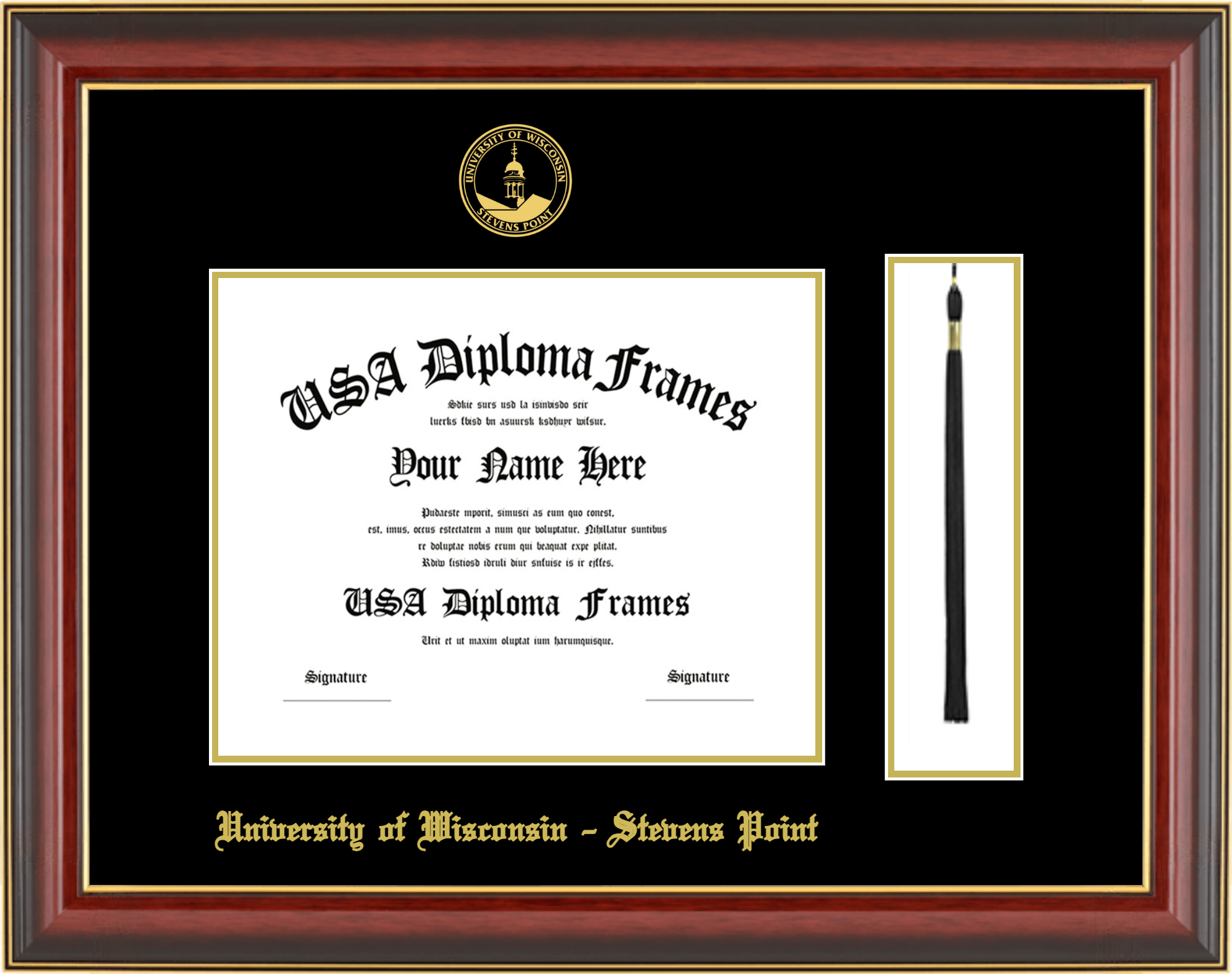 University of Wisconsin – Stevens Point – Single Horizontal Document ( Diploma ) – Cherry Mahogany Gold Trim Glossy – Black Mat – Gold Accent Mat – With Tassel(Default) – With Seal(University Seal Gold) – With Gold Embossing (University of Wisconsin – Stevens Point)
