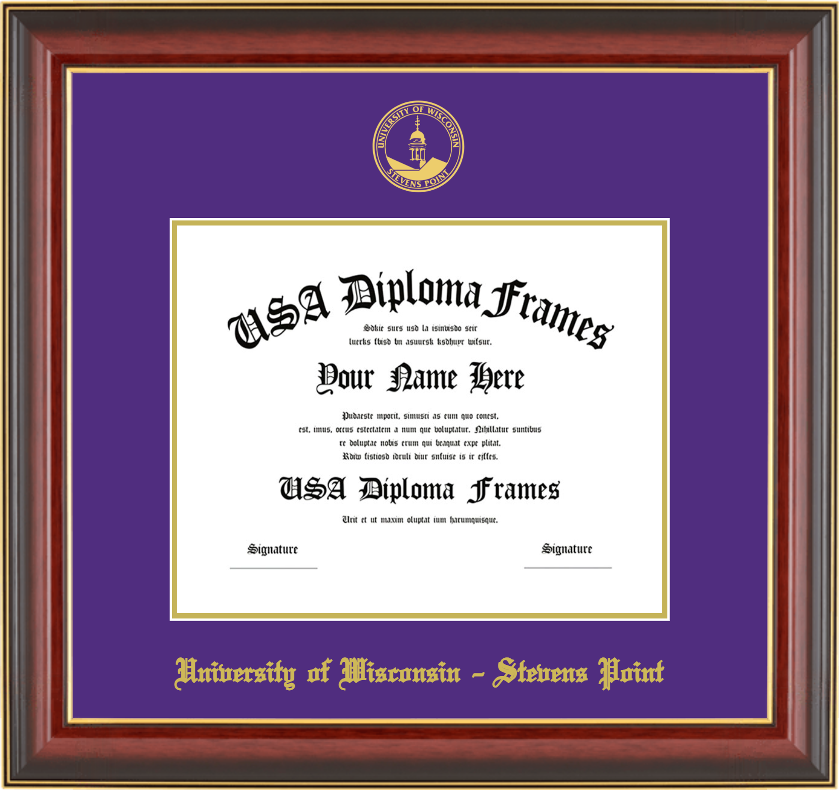 University of Wisconsin – Stevens Point – Single Horizontal Document ( Diploma ) – Cherry Mahogany Gold Trim Glossy – Purple Mat – Gold Accent Mat – With Seal(University Seal Gold) – With Gold Embossing (University of Wisconsin – Stevens Point)