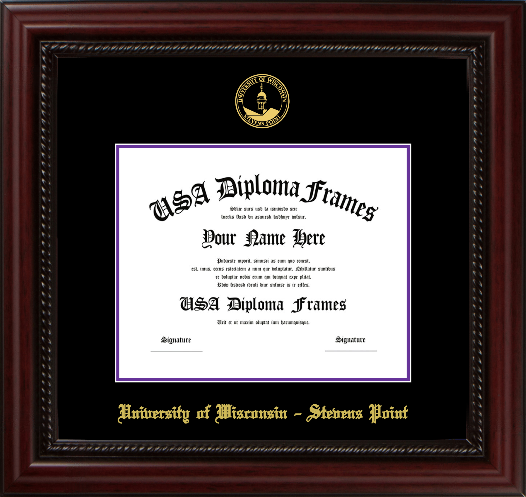 University of Wisconsin – Stevens Point – Single Horizontal Document ( Diploma ) – Executive Cherry Rope – Black Mat – Purple Accent Mat – With Seal(University Seal Gold) – With Gold Embossing (University of Wisconsin – Stevens Point)