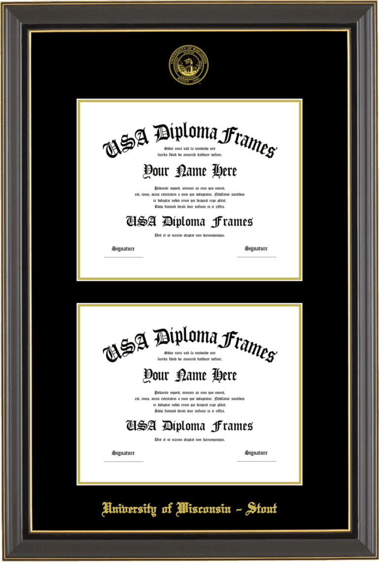 University of Wisconsin – Stout Double Diploma Frame – Double Document – Black Gold Trim Glossy – Black and Gold Mat