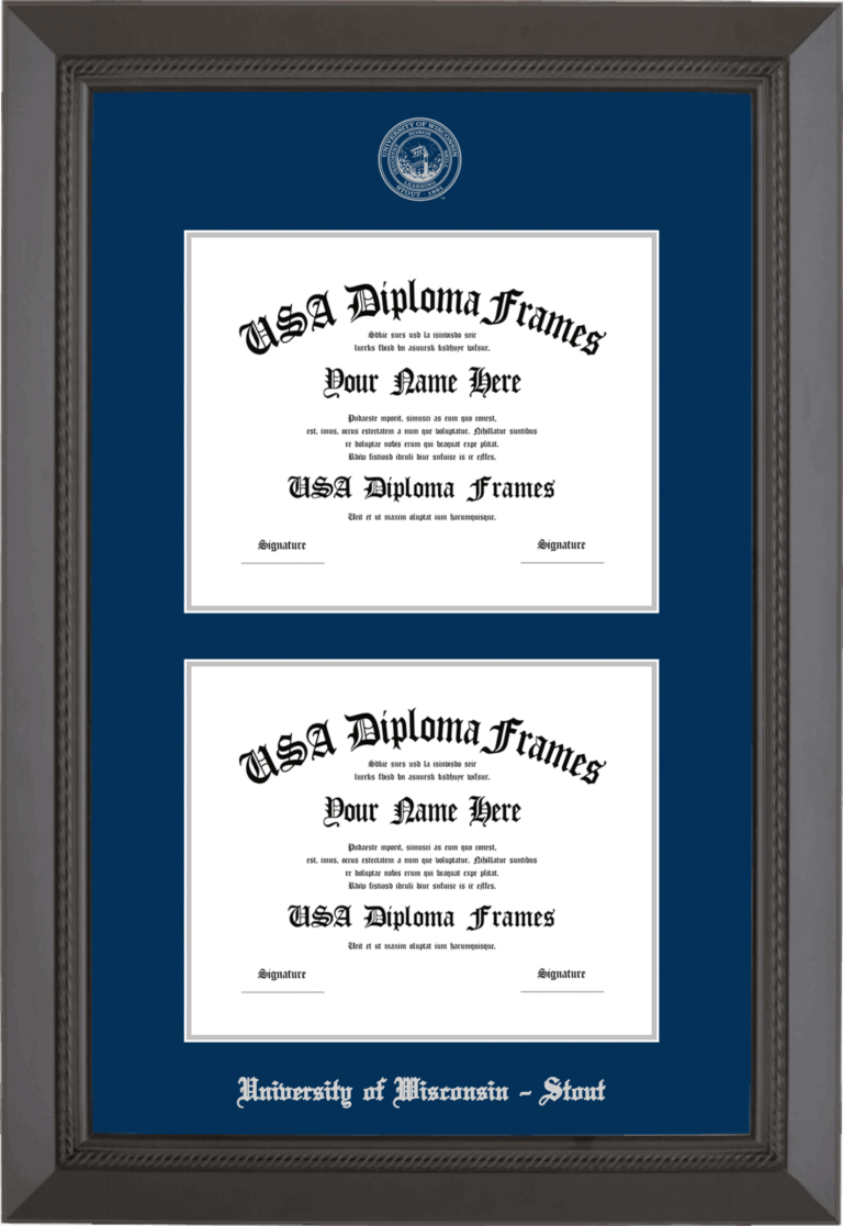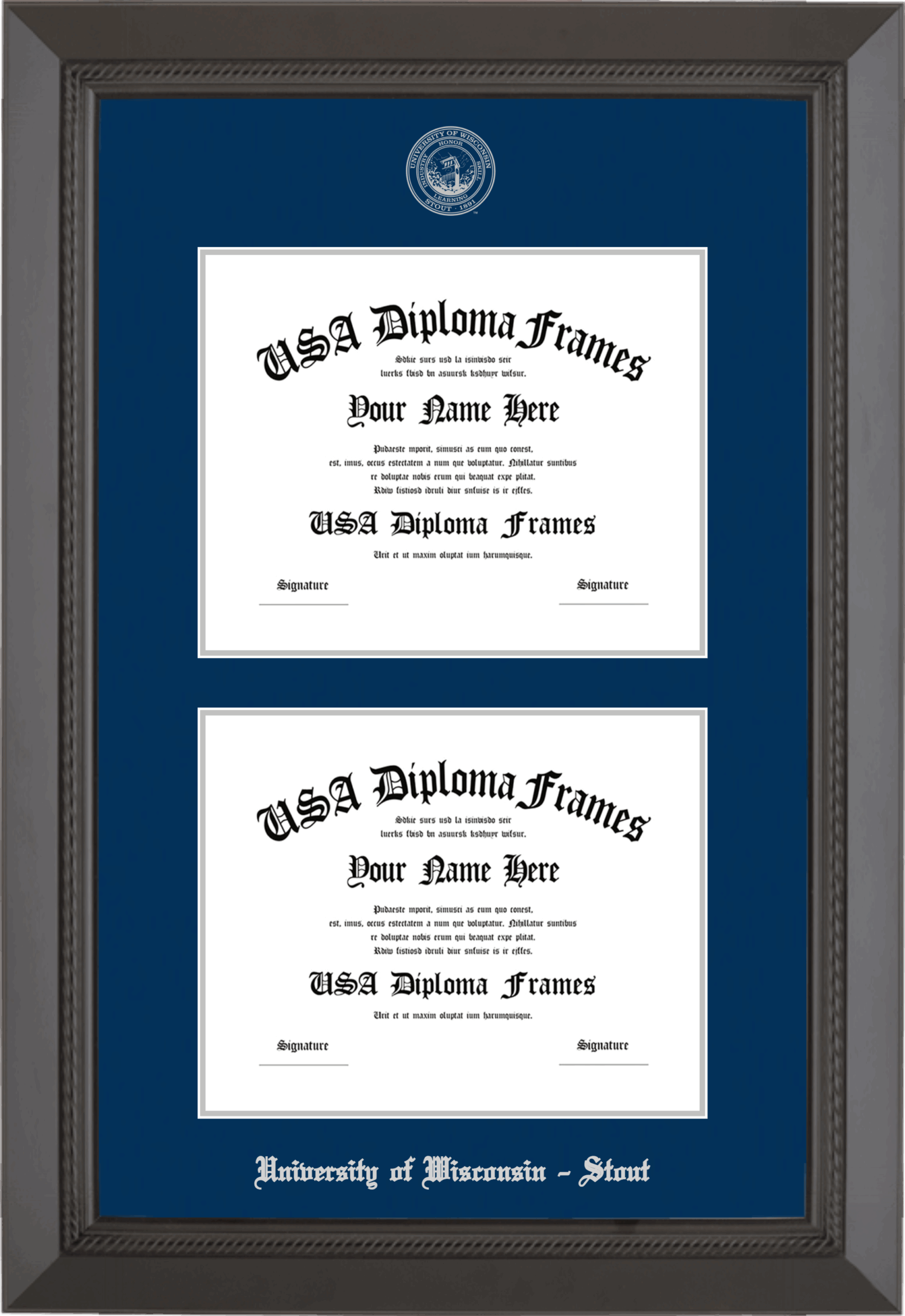 University of Wisconsin – Stout Double Diploma Frame – Double Document – Black Rope – Navy and Silver Mat