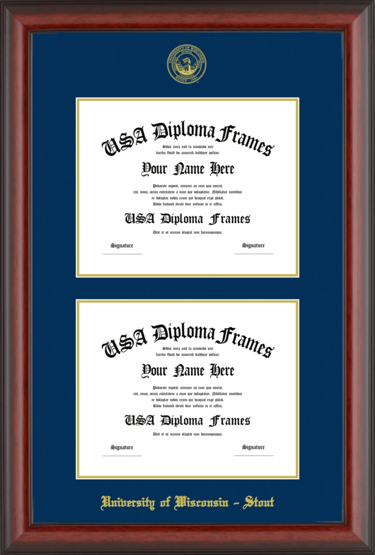 University of Wisconsin – Stout Double Diploma Frame – Double Document – Cherry Mahogany Matte – Navy and Gold Mat
