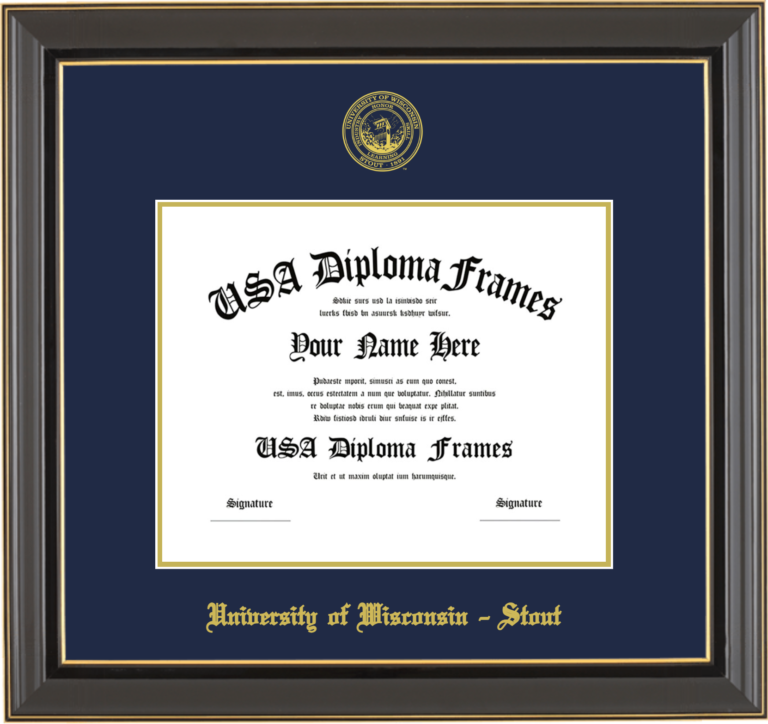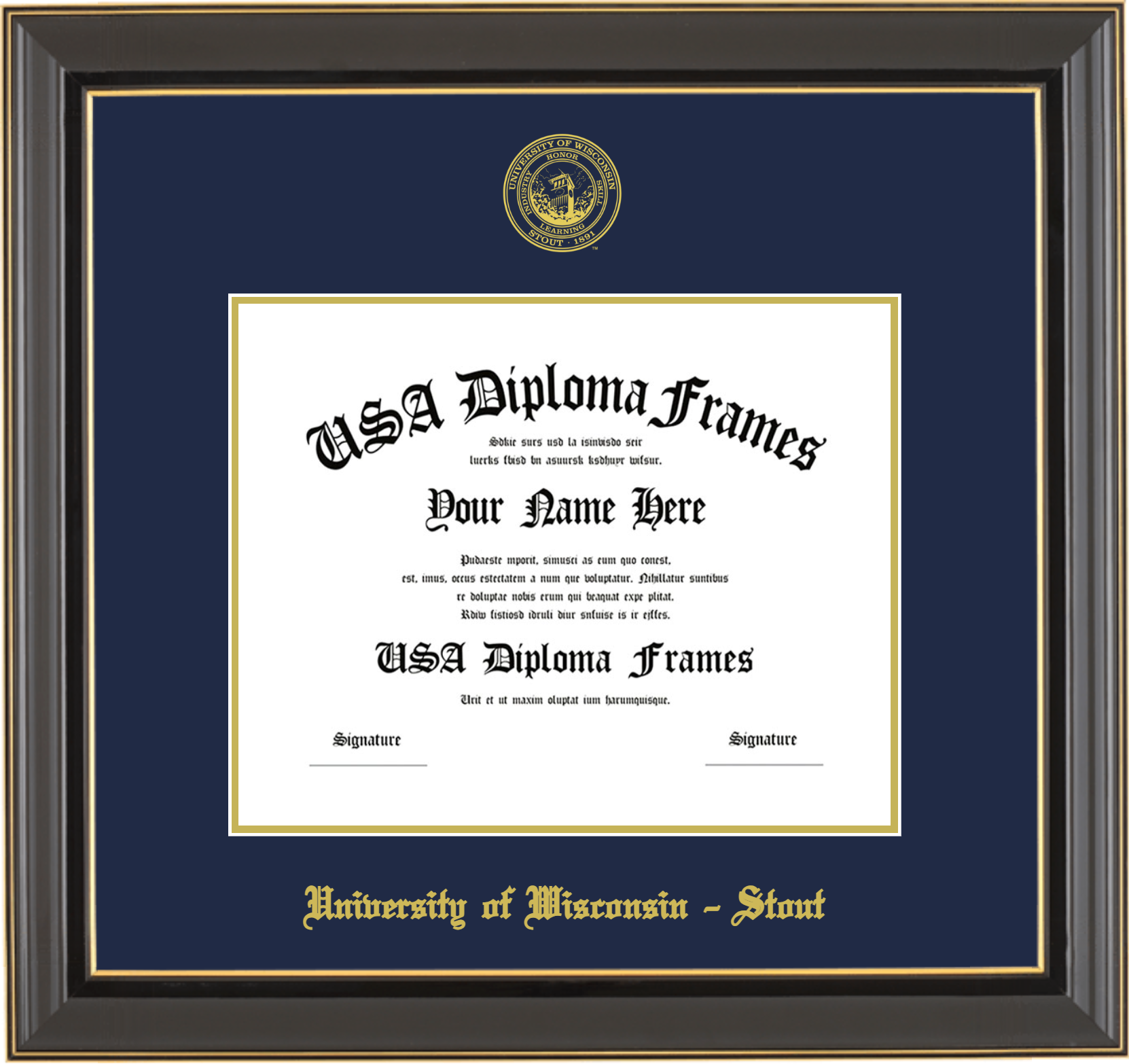 University of Wisconsin – Stout – Single Horizontal Document ( Diploma ) – Black Gold Trim Glossy – Navy Mat – Gold Accent Mat – With Seal(University Seal Gold) – With Gold Embossing (University of Wisconsin – Stout)