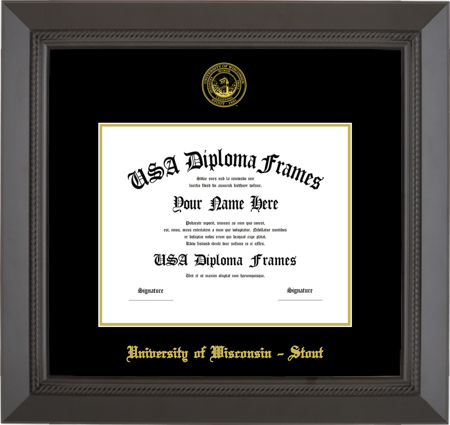 University of Wisconsin – Stout – Single Horizontal Document ( Diploma ) – Black Rope – Black Mat – Gold Accent Mat – With Seal(University Seal Gold) – With Gold Embossing (University of Wisconsin – Stout)