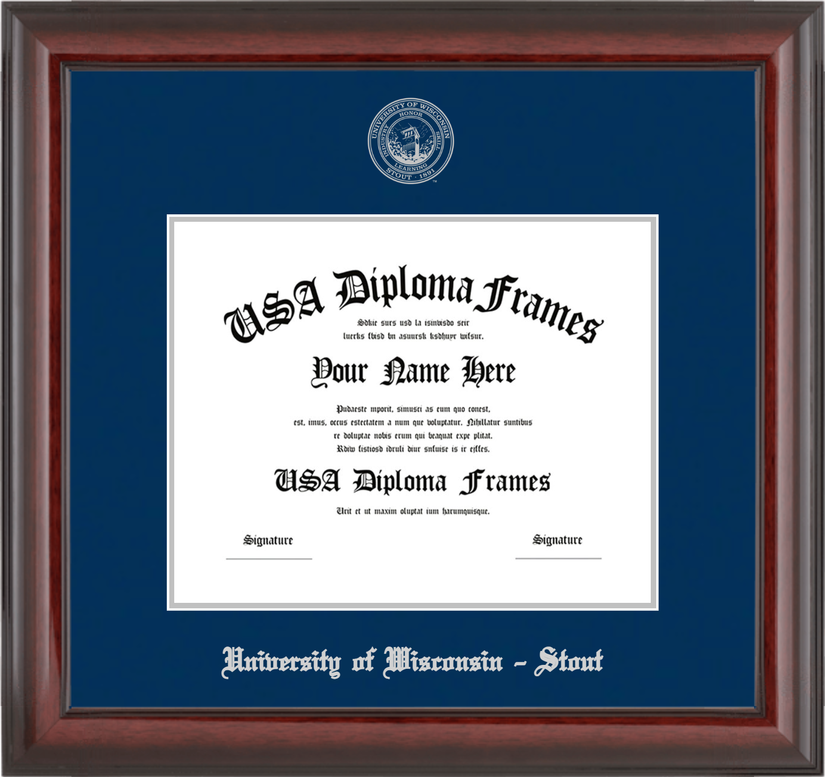 University of Wisconsin – Stout – Single Horizontal Document ( Diploma ) – Cherry Mahogany Glossy – Navy Mat – Silver Accent Mat – With Seal(University Seal Silver) – With Silver Embossing (University of Wisconsin – Stout)