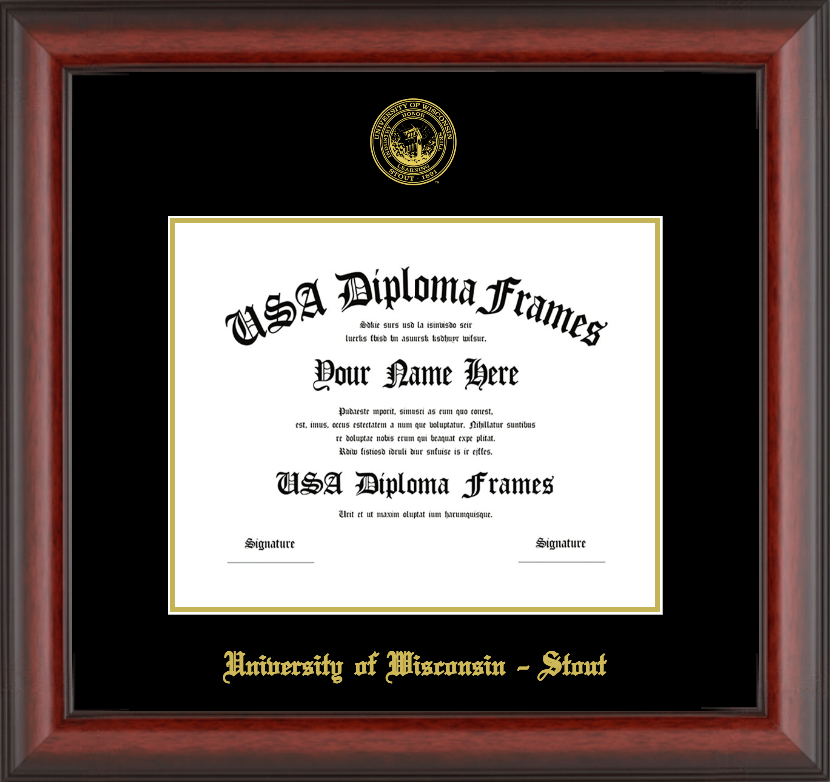 University of Wisconsin – Stout Diploma Frame – Cherry Mahogany Matte – Black and Gold Mat