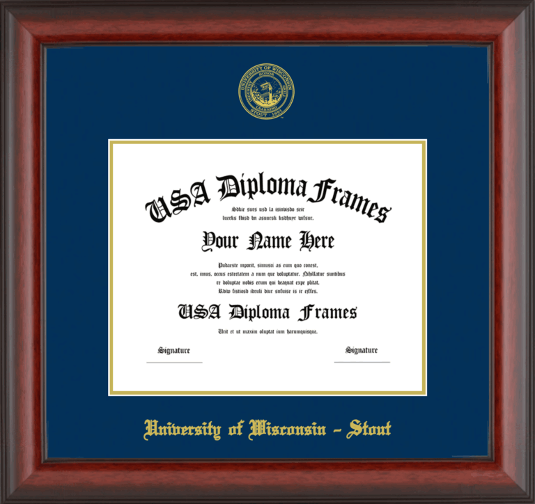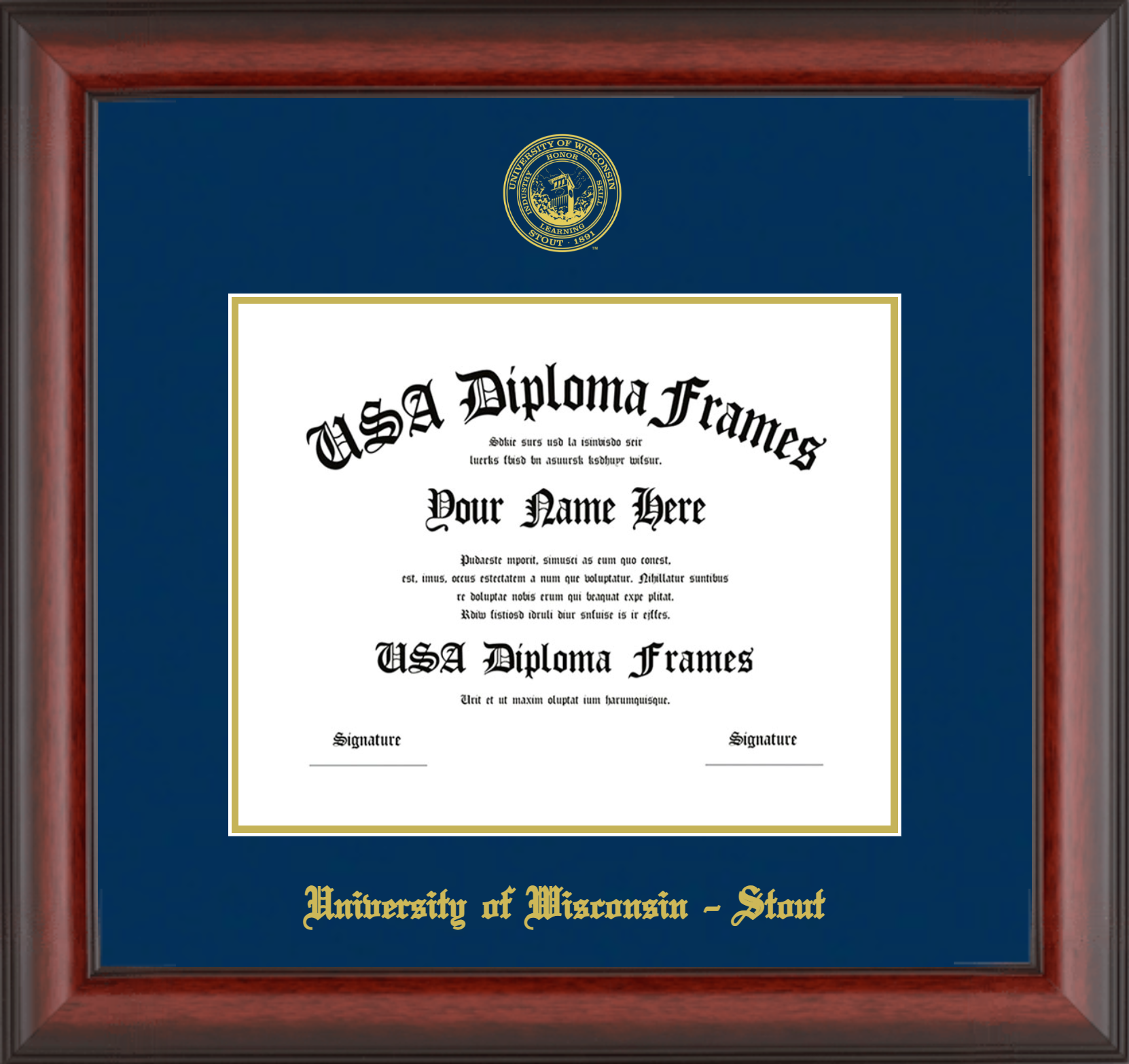 University of Wisconsin – Stout – Single Horizontal Document ( Diploma ) – Cherry Mahogany Matte – Navy Mat – Gold Accent Mat – With Seal(University Seal Gold) – With Gold Embossing (University of Wisconsin – Stout)