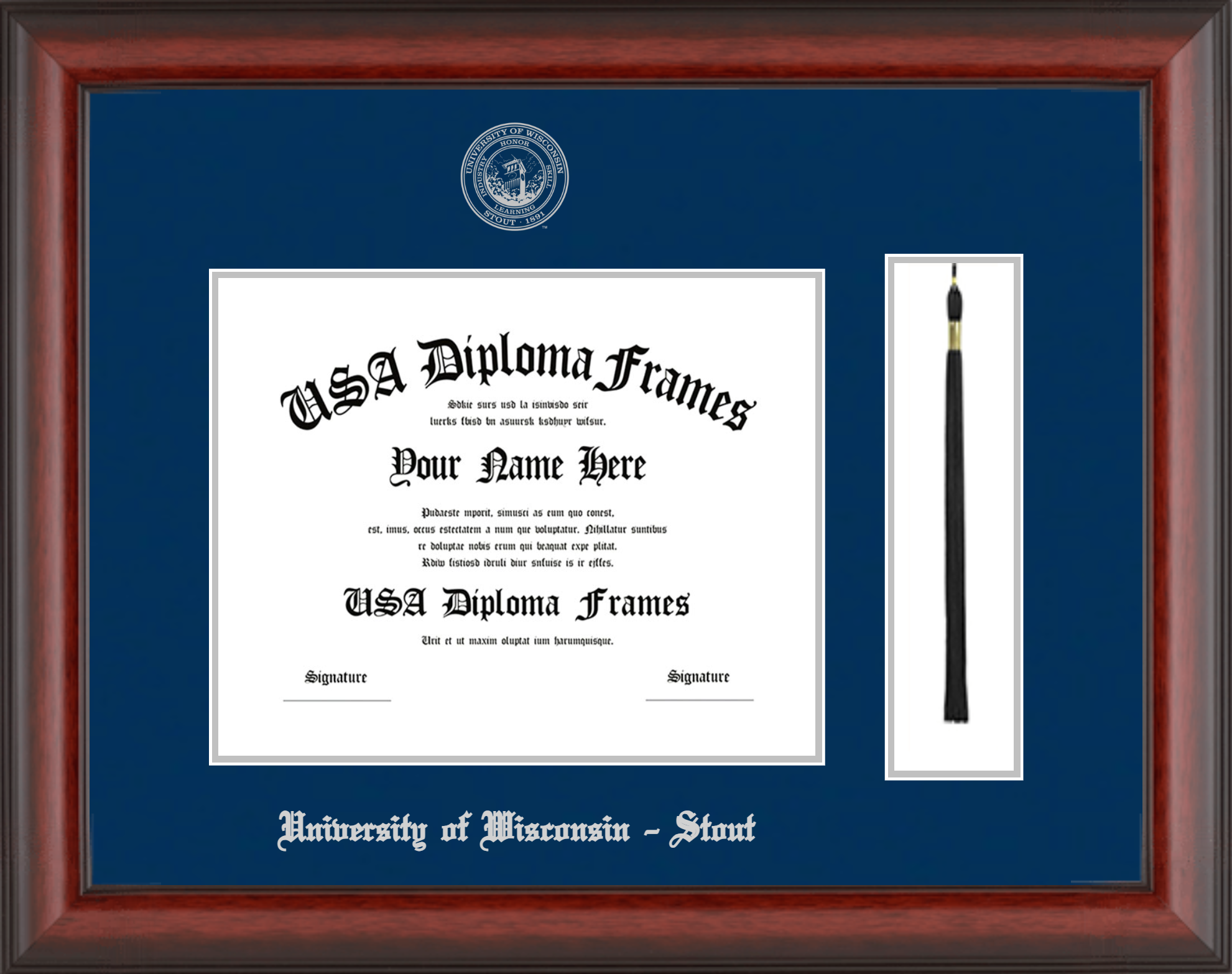University of Wisconsin – Stout – Single Horizontal Document ( Diploma ) – Cherry Mahogany Matte – Navy Mat – Silver Accent Mat – With Tassel(Default) – With Seal(University Seal Silver) – With Silver Embossing (University of Wisconsin – Stout)