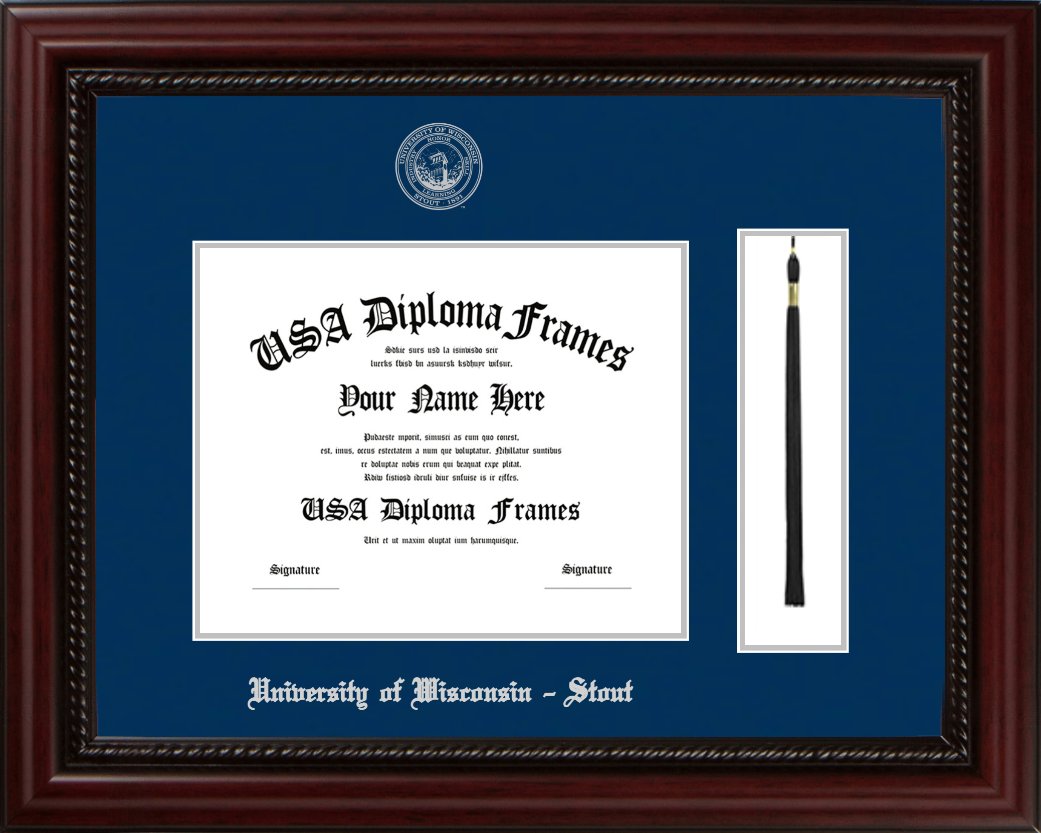 University of Wisconsin – Stout – Single Horizontal Document ( Diploma ) – Executive Cherry Rope – Navy Mat – Silver Accent Mat – With Tassel(Default) – With Seal(University Seal Silver) – With Silver Embossing (University of Wisconsin – Stout)