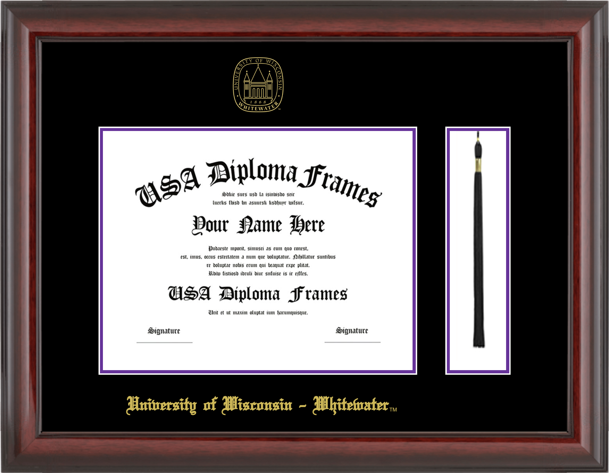 University of Wisconsin – Whitewater Diploma Frame with Tassel – Cherry Mahogany Glossy – Black and Purple Mat
