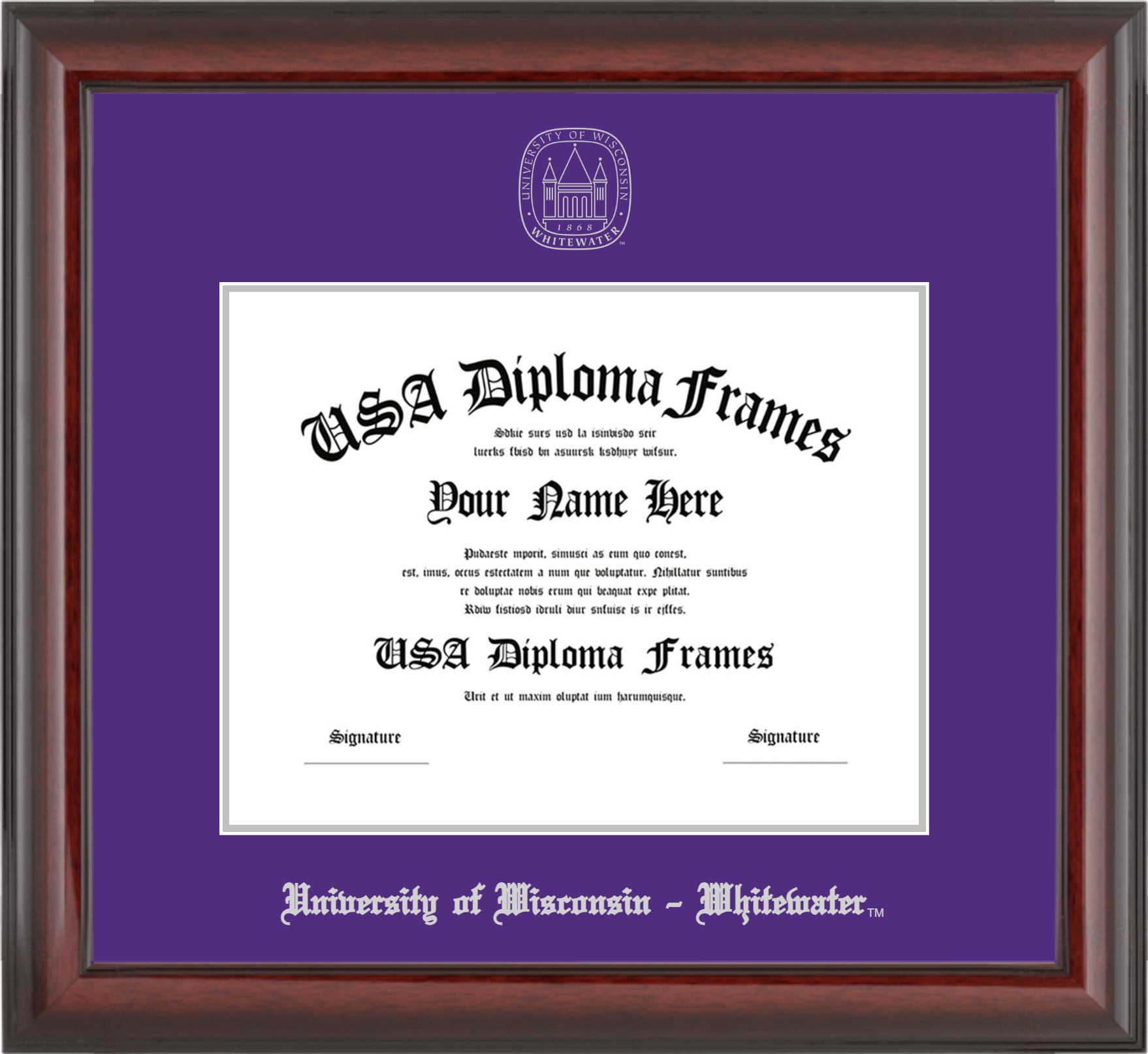 University of Wisconsin – Whitewater – Single Horizontal Document ( Diploma ) – Cherry Mahogany Glossy – Purple Mat – Silver Accent Mat – With Seal(University Seal Silver) – With Silver Embossing (University of Wisconsin – Whitewater)