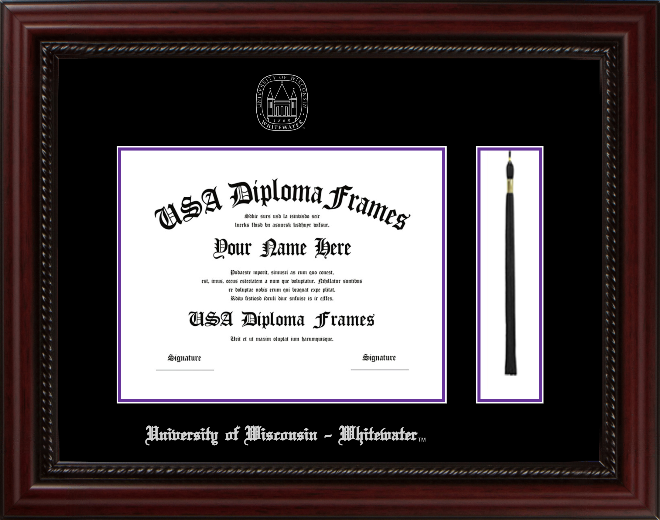 University of Wisconsin – Whitewater Diploma Frame with Tassel – Executive Cherry Rope – Black and Purple Mat – Silver Seal