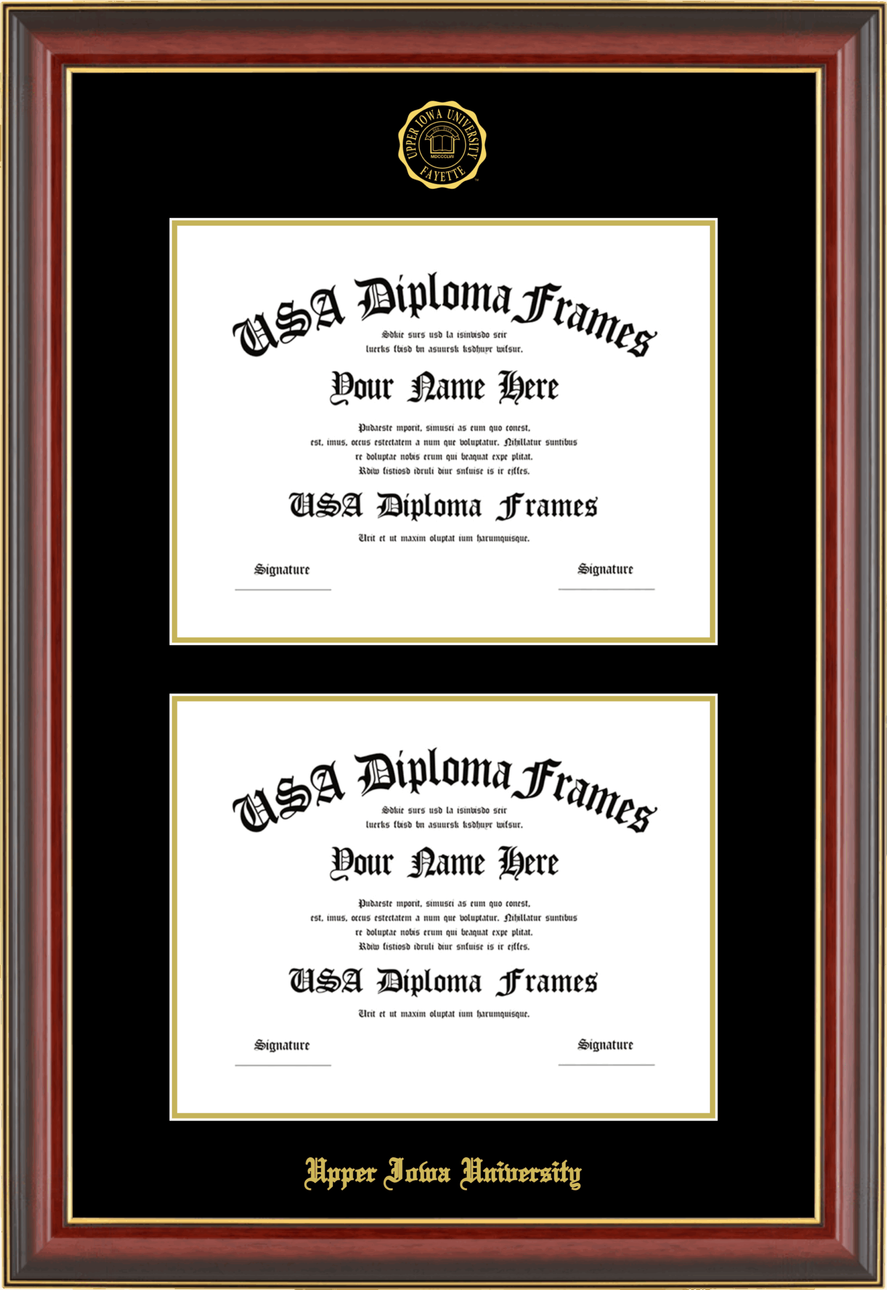 Upper Iowa University Double Diploma Frame – Double Document – Cherry Mahogany Gold Trim Glossy – Black and Gold Mat