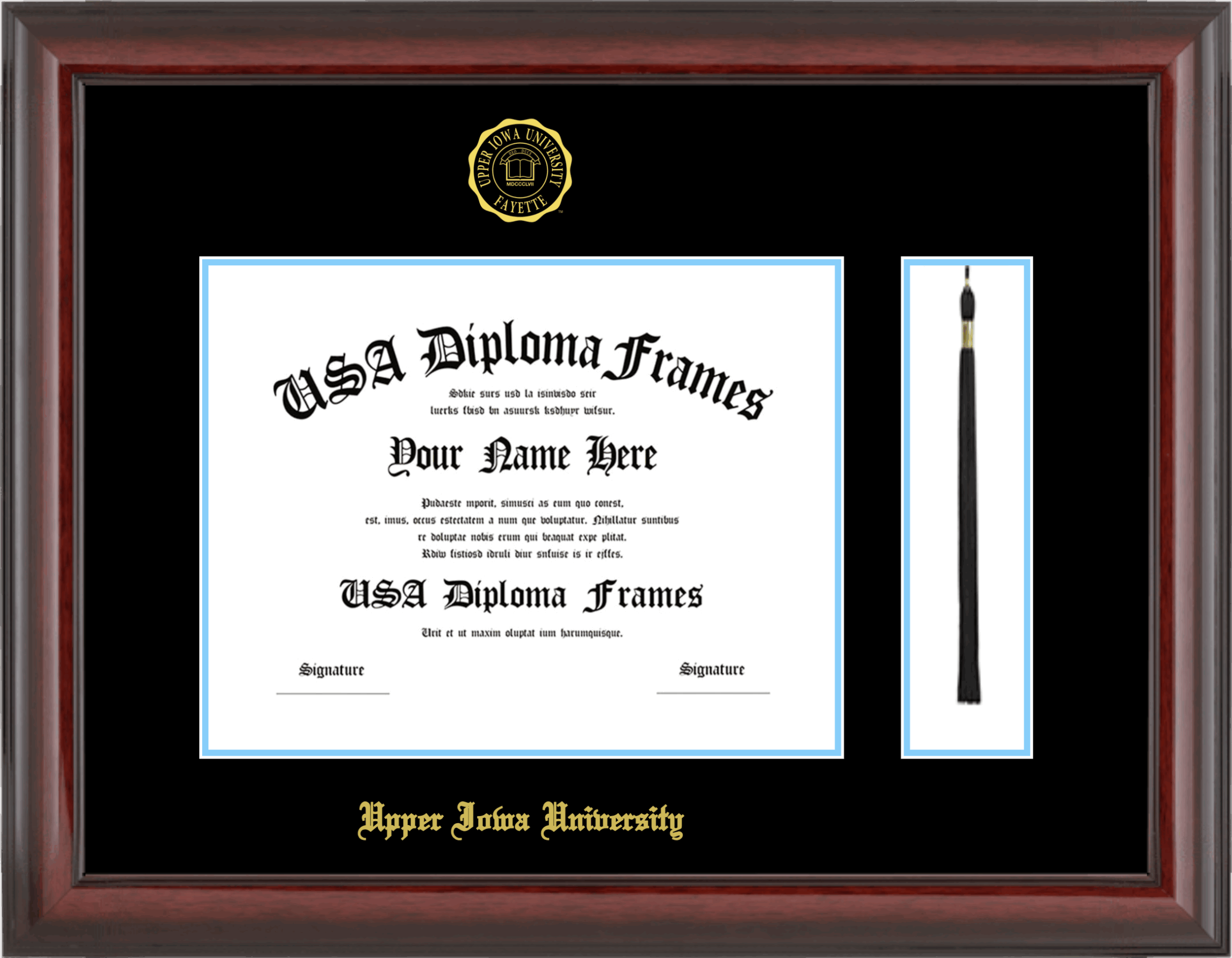 Upper Iowa University Diploma Frame with Tassel – Cherry Mahogany Glossy – Black and Light Blue Mat