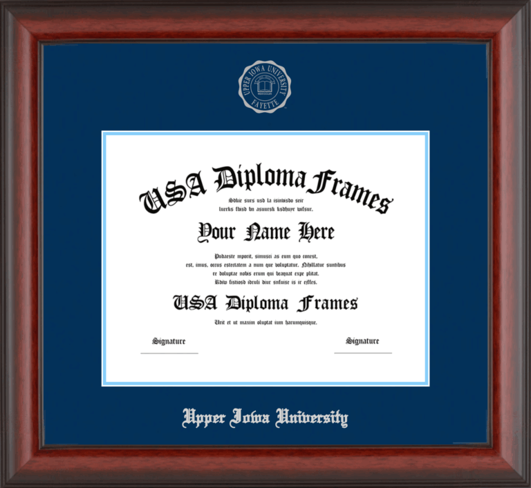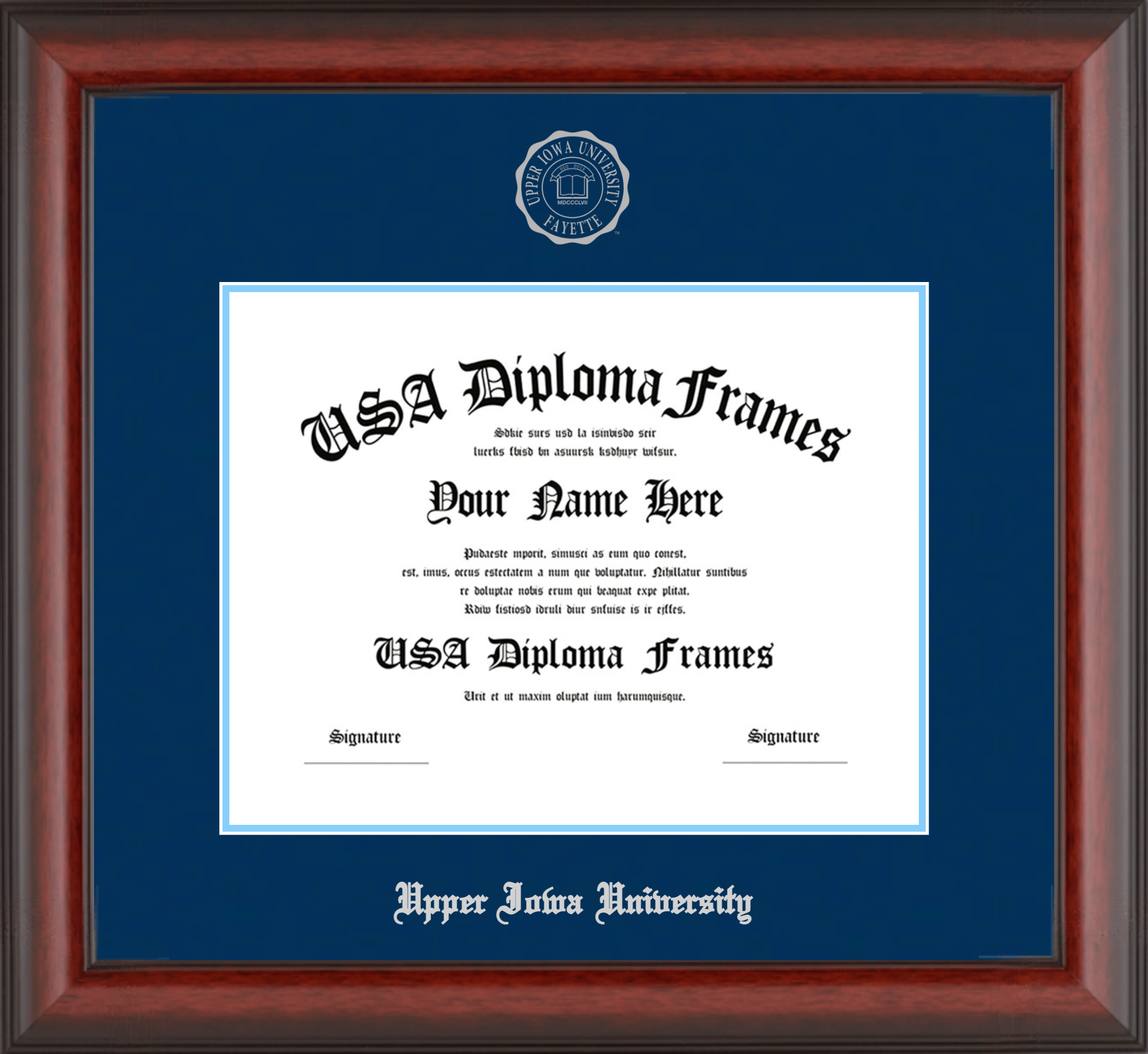 Upper Iowa University Diploma Frame – Cherry Mahogany Matte – Navy and Light Blue Mat – Silver Seal