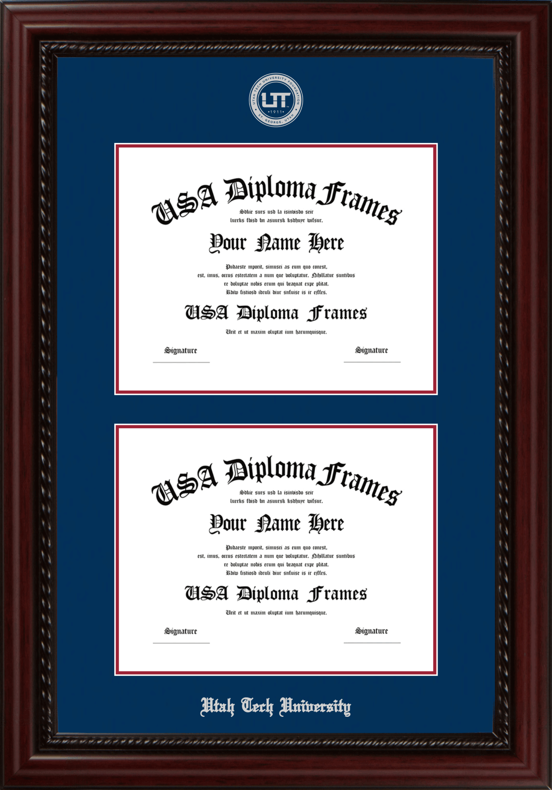 Utah Tech University Double Diploma Frame – Double Document – Executive Cherry Rope – Navy and Crimson Mat