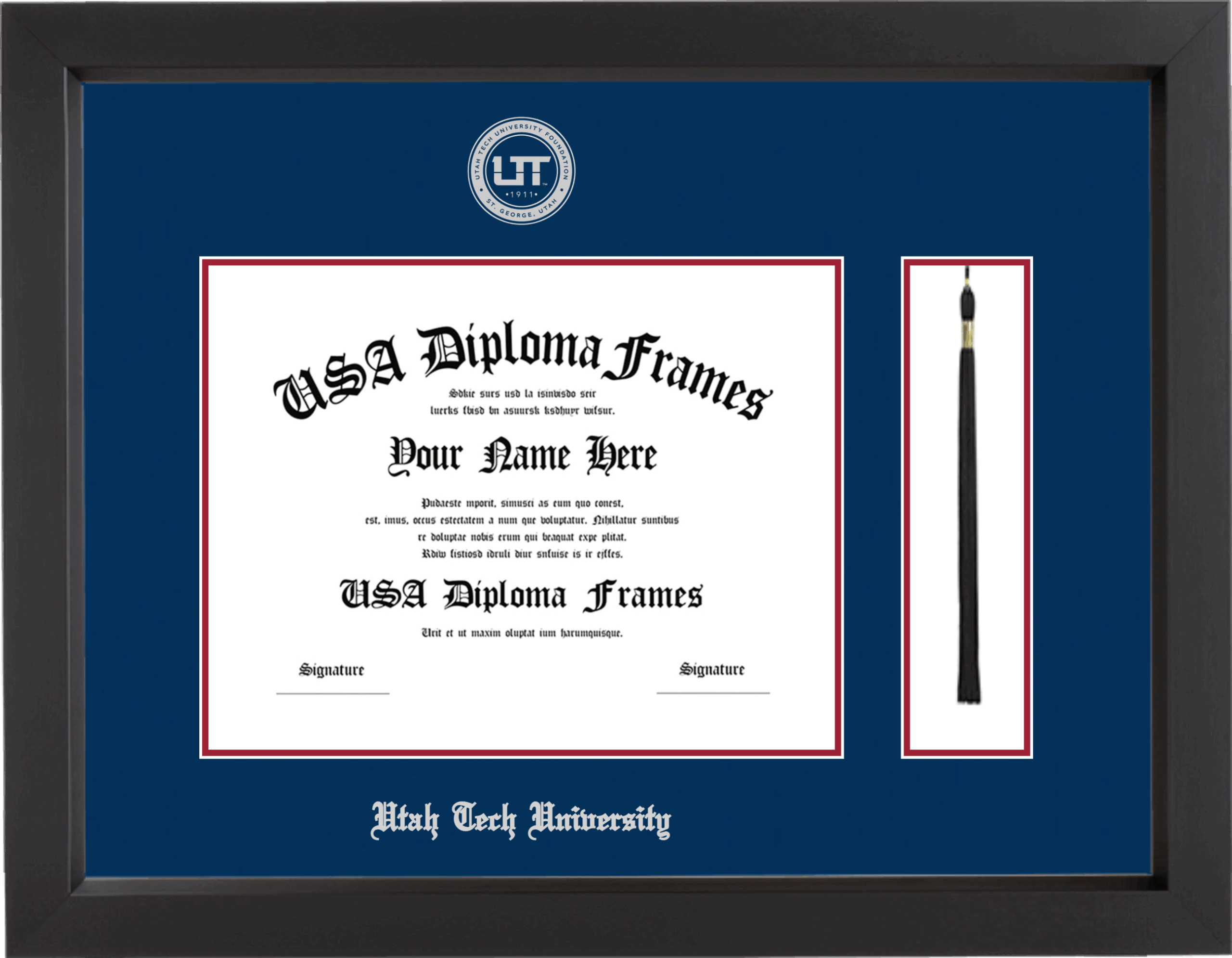 Utah Tech University Diploma Frame with Tassel – Black Matte – Navy and Crimson Mat – Silver Seal