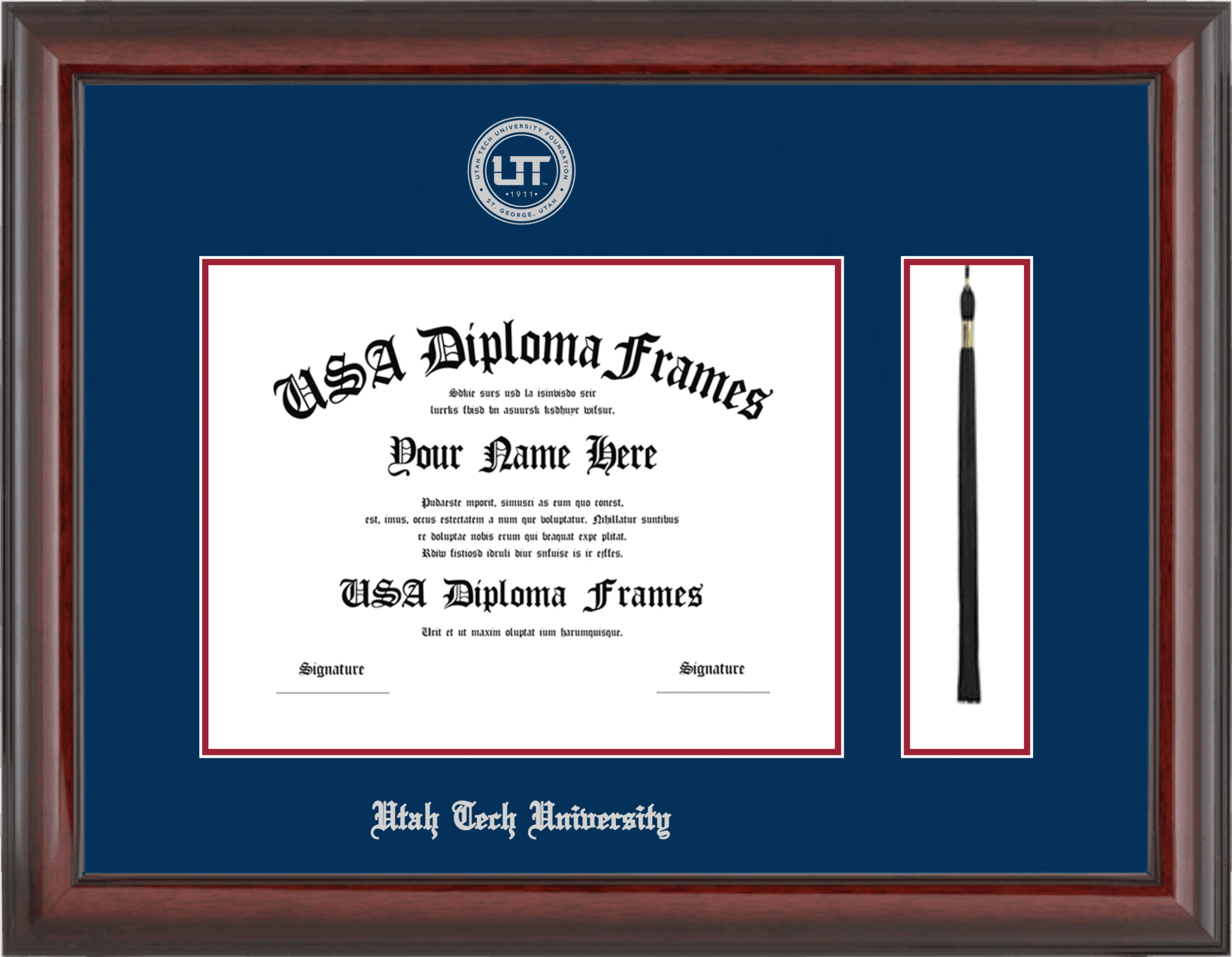 Utah Tech University Diploma Frame with Tassel – Cherry Mahogany Glossy – Navy and Crimson Mat – Silver Seal