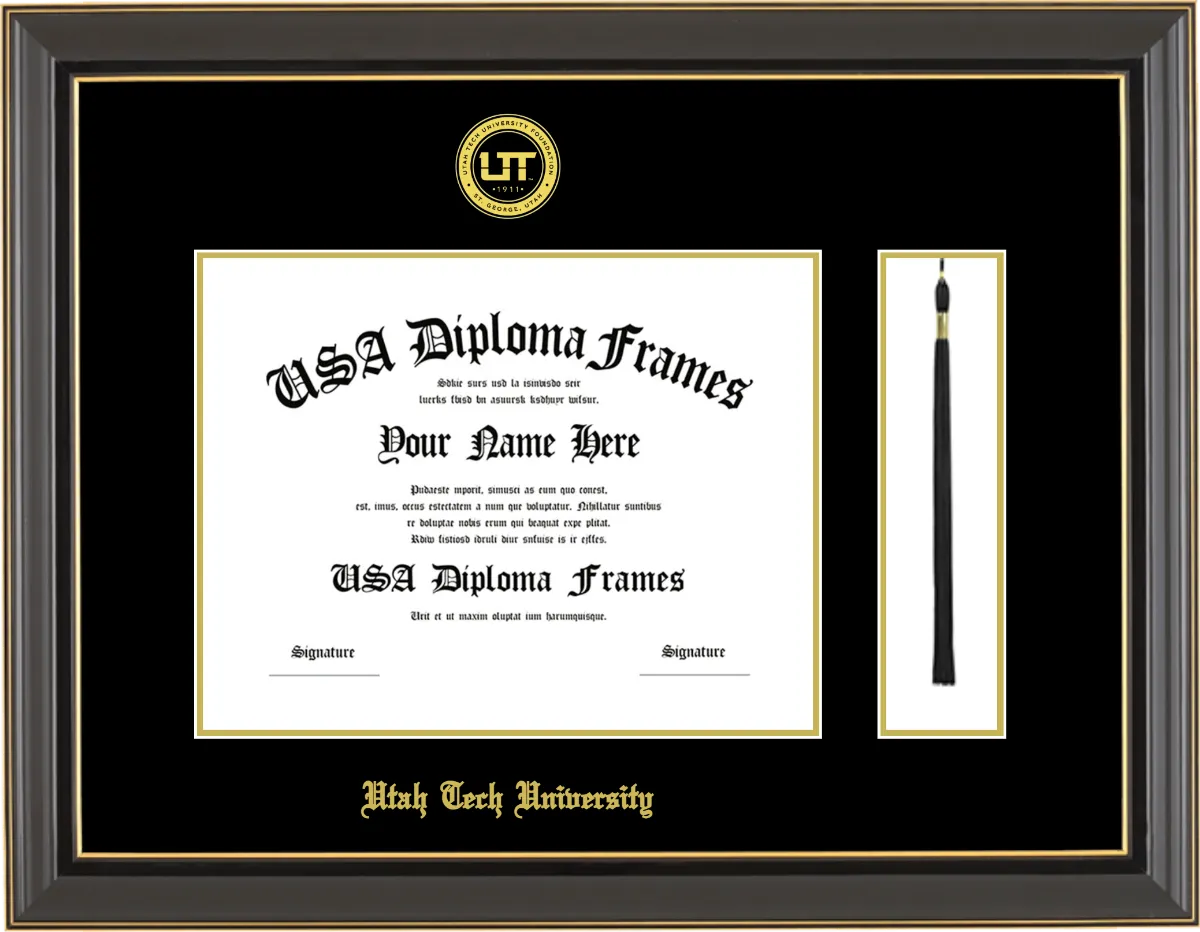 Utah Tech University – Single Horizontal Document ( Diploma ) – Black Gold Trim Glossy – Black Mat – Gold Accent Mat – With Tassel(Default) – With Seal(University Seal Gold) – With Gold Embossing (Utah Tech University)