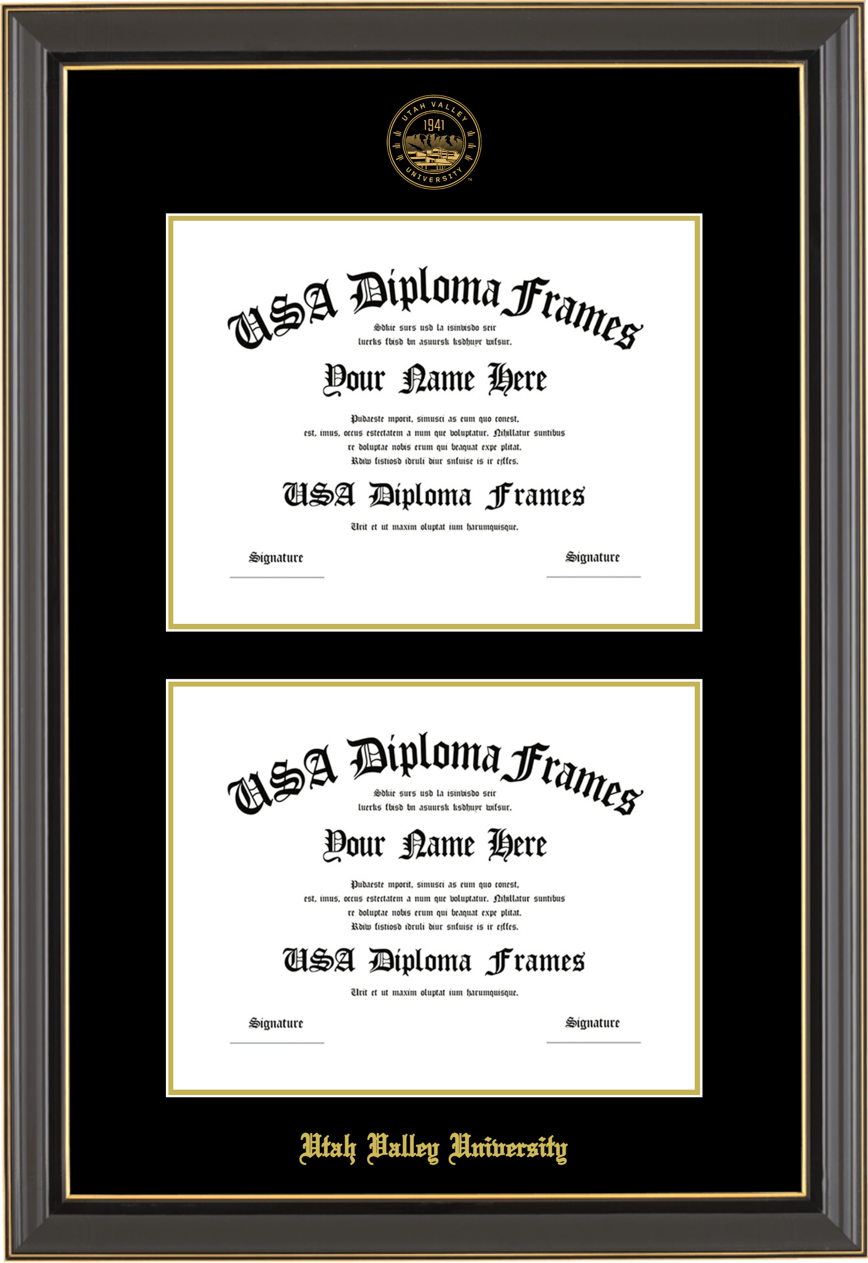 Utah Valley University Double Diploma Frame – Double Document – Black Gold Trim Glossy – Black and Gold Mat