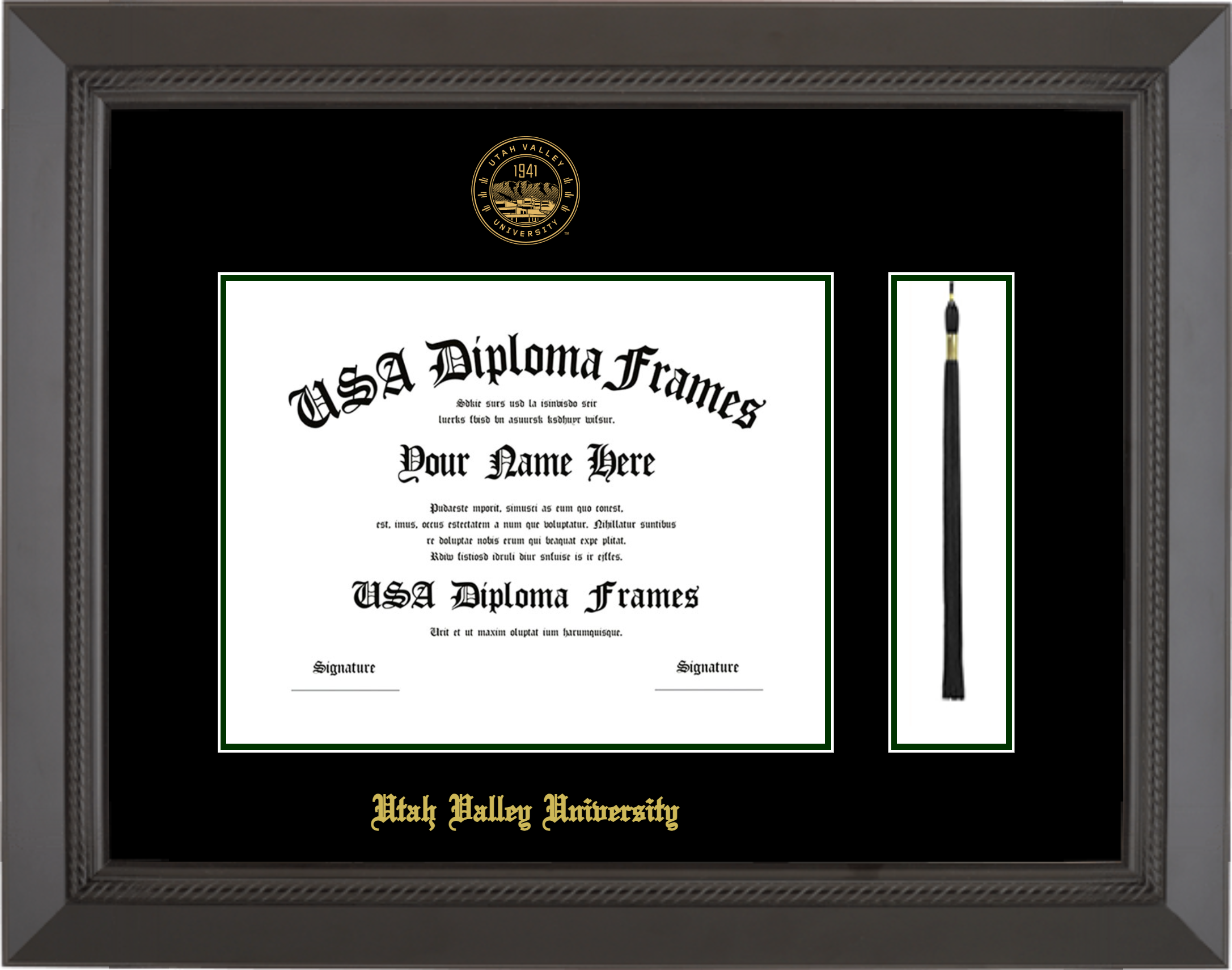 Utah Valley University Diploma Frame with Tassel – Black Rope – Black and Winter Green Mat