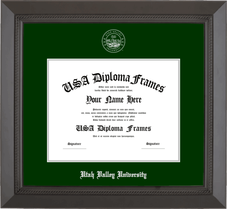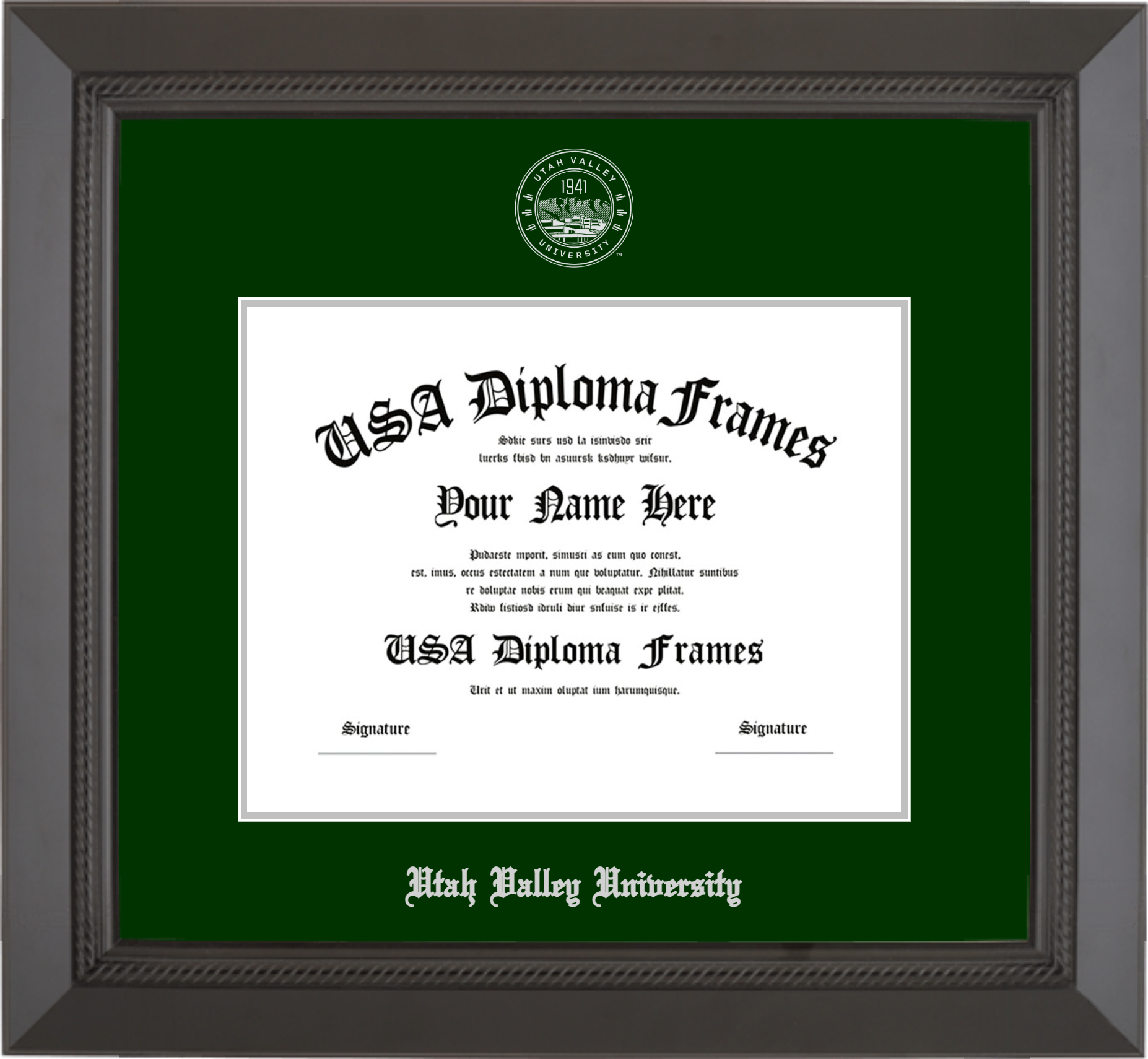 Utah Valley University Diploma Frame – Black Rope – Winter Green and Silver Mat