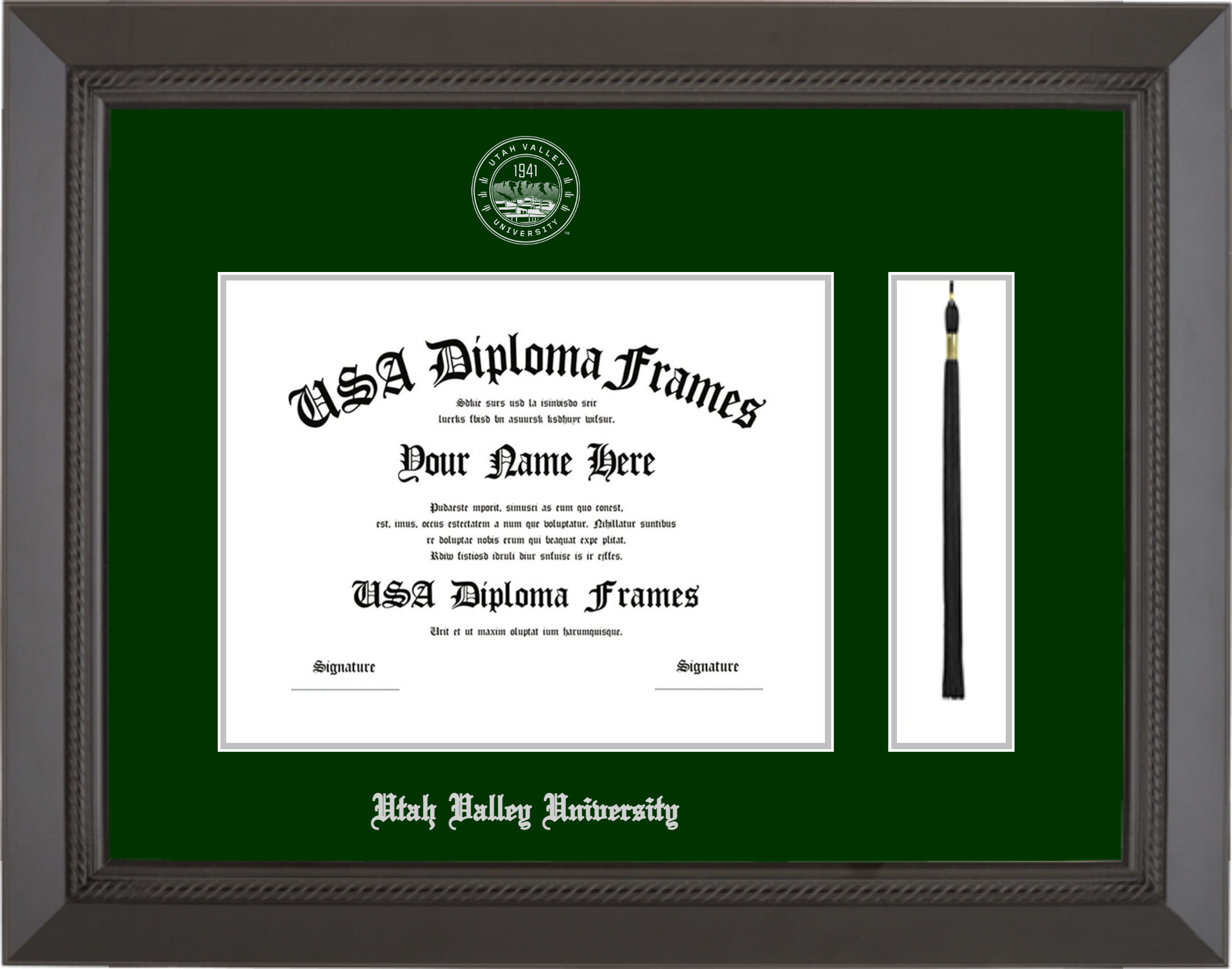 Utah Valley University Diploma Frame with Tassel – Black Rope – Winter Green and Silver Mat