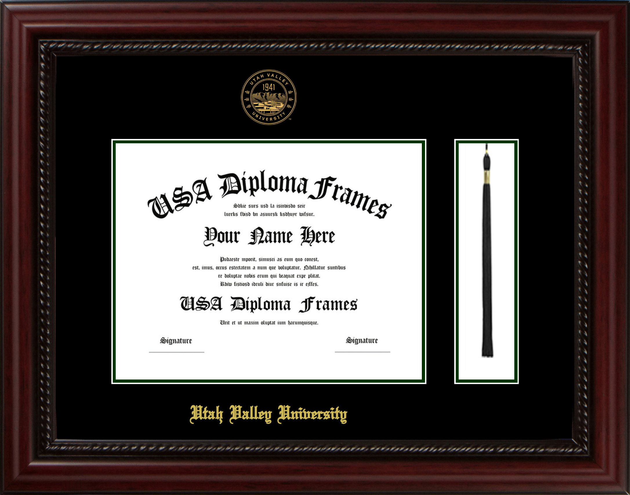 Utah Valley University Diploma Frame with Tassel – Executive Cherry Rope – Black and Winter Green Mat