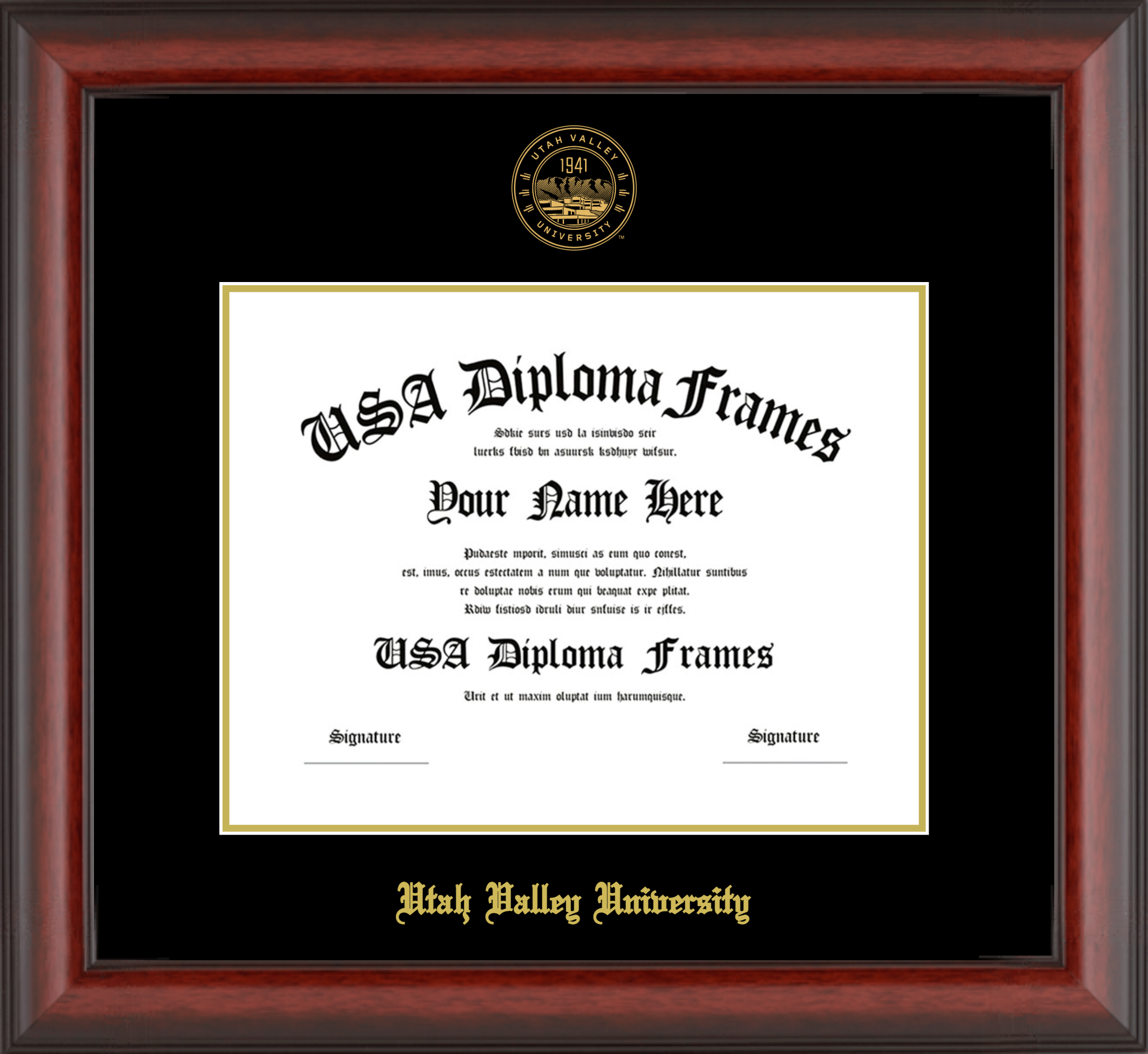 Utah Valley University Diploma Frame – Cherry Mahogany Matte – Black and Gold Mat