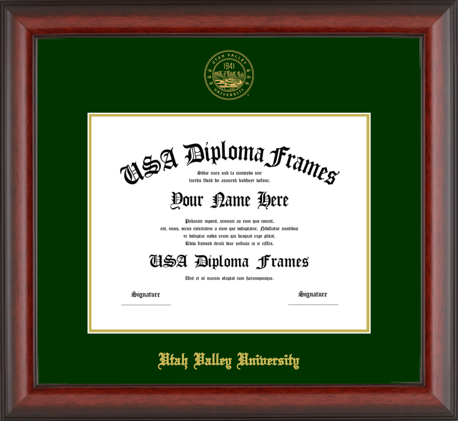 Utah Valley University – Single Horizontal Document ( Diploma ) – Cherry Mahogany Matte – Winter Green Mat – Gold Accent Mat – With Seal(University Seal Gold) – With Gold Embossing (Utah Valley University)