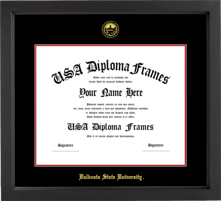 Want to explore more styles? Browse our full range of diploma frame layouts, or visit the Valdosta State University to view options available for your school. Looking for a fully personalized design? Try our custom Frame Builder and create a frame that’s uniquely yours.