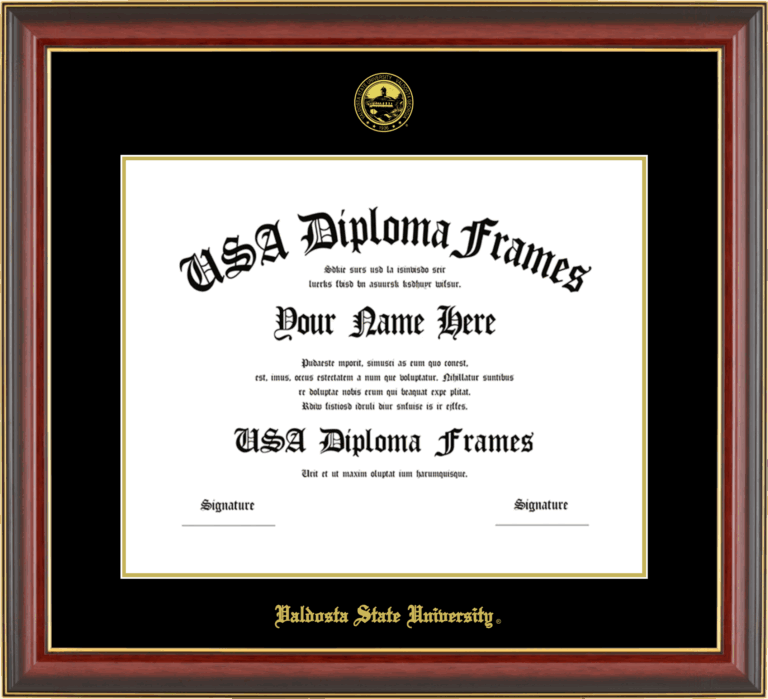 Want to explore more styles? Browse our full range of diploma frame layouts, or visit the Valdosta State University to view options available for your school. Looking for a fully personalized design? Try our custom Frame Builder and create a frame that’s uniquely yours.