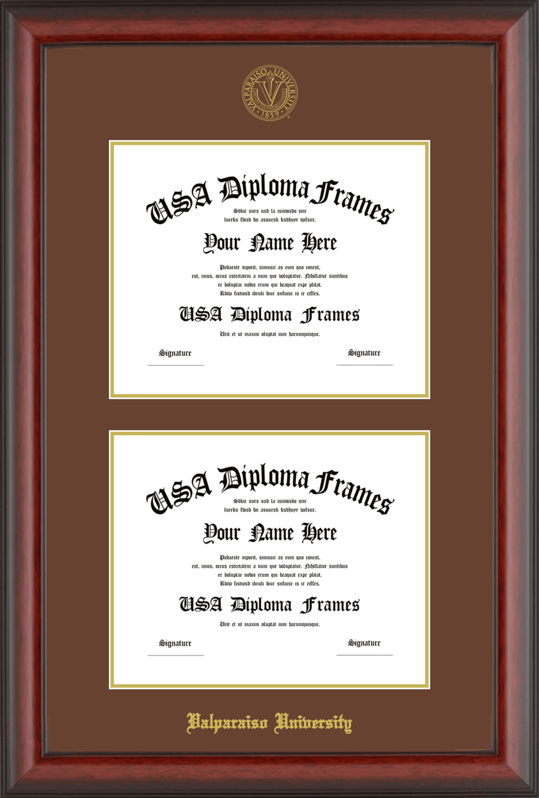 Valparaiso University Double Diploma Frame – Double Document – Cherry Mahogany Matte – Brown and Gold Mat