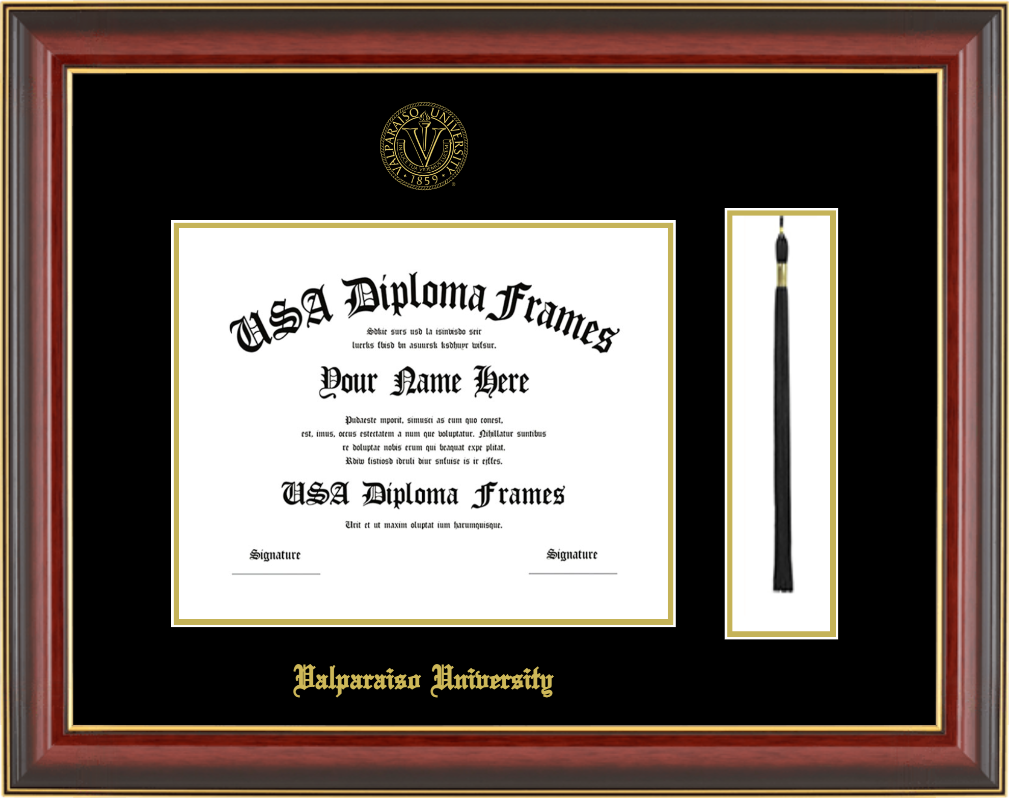 Valparaiso University – Single Horizontal Document ( Diploma ) – Cherry Mahogany Gold Trim Glossy – Black Mat – Gold Accent Mat – With Tassel(Default) – With Seal(University Seal Gold) – With Gold Embossing (Valparaiso University)