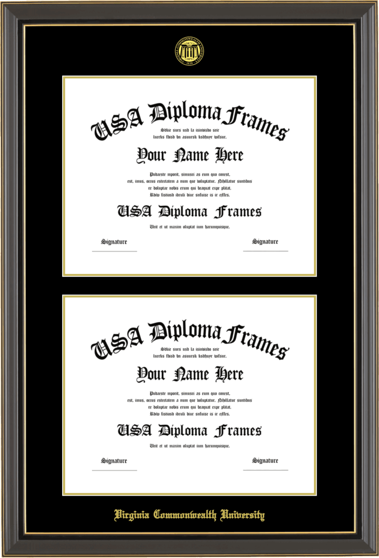 Virginia Commonwealth University Double Diploma Frame – Double Document – Black Gold Trim Glossy – Black and Gold Mat