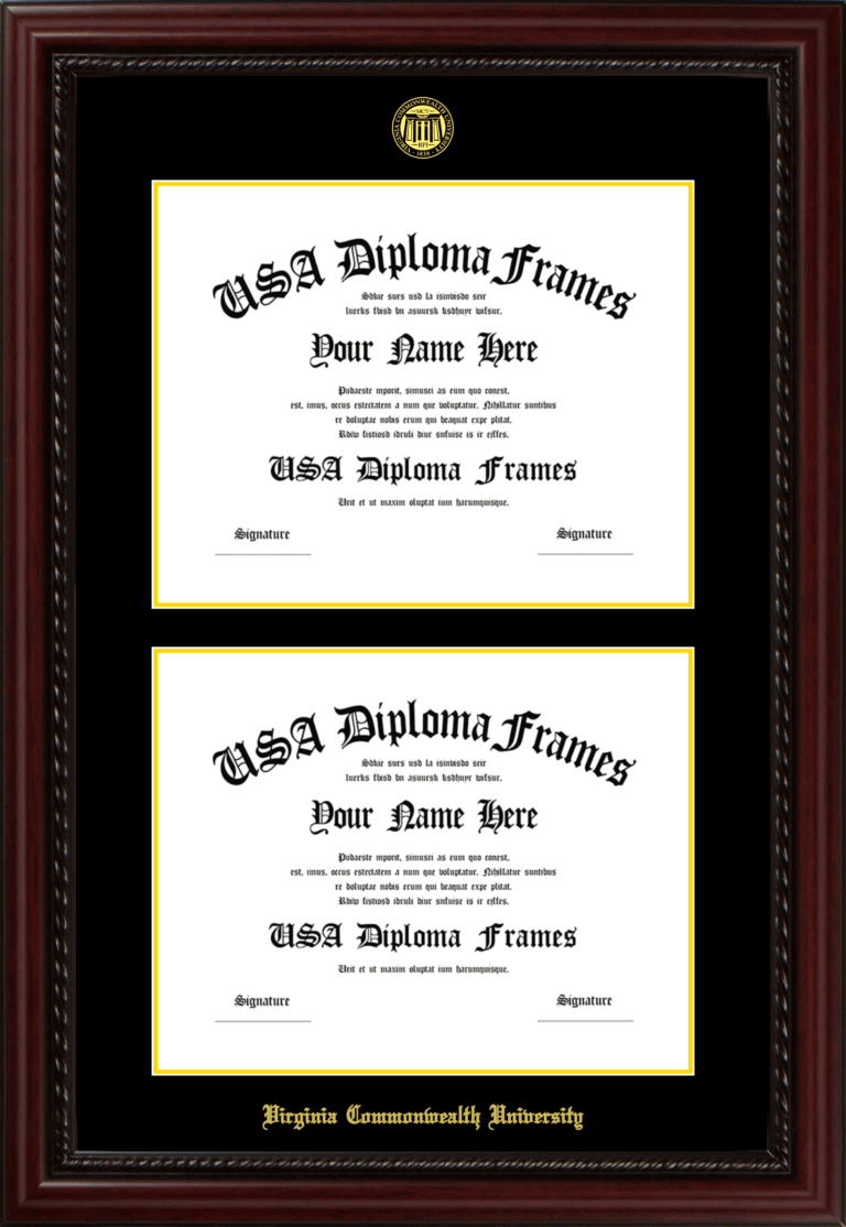 Virginia Commonwealth University Double Diploma Frame – Double Document – Executive Cherry Rope – Black and Yellow Gold Mat